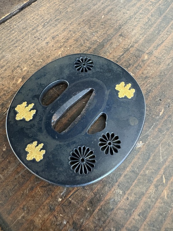 Here is another kinko tsuba, one whose material is a little challenging (for me) to identify with confidence. It seems like lower-quality shakudo, but very well may be of some other metal or alloy. As with the previous tsuba, this one features gold or gold-colored accents in the kiri mon motif elements. This piece also three very crisply-done kiku sukashi elements. The overall presentation of this tsuba, with its very small kogai-ana, suggests latest-Edo to me (seppazuri hints at this being a late-Edo work rather than 20th-century, but honestly, I think the tsuba does come across as being of such recent vintage. It measures 7.1 cm x 6.6 cm x 4mm. $75.00, plus shipping.