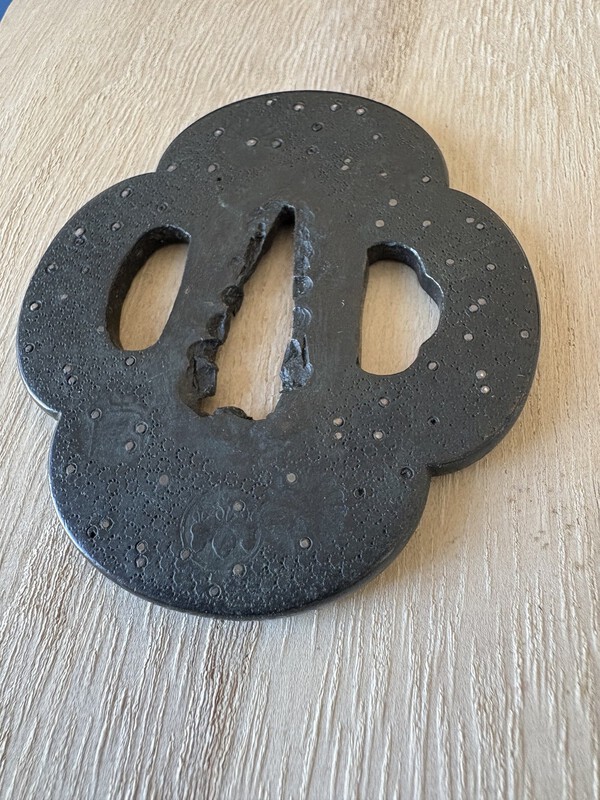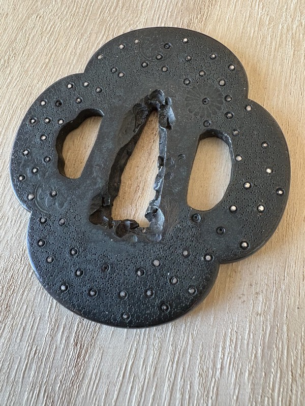 This is a mokko kinko work that may date to pre-Edo, and is almost certainly no later than early-Edo. It features numerous inlaid brass dots, some of which are missing, together with subtly carved mon elements amidst a field of small circular spots. I believe the material is yamagane, plus the brass dots. It measures 6.7 cm x 6.1 cm x 3mm. $125.00, plus shipping.
