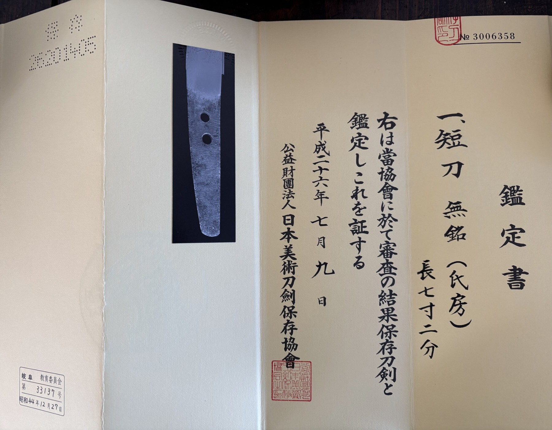 Offered here is a tanto I am helping a friend find a new home for, papered to Ujifusa by the NBTHK (2014 shinsa). The blade is mumei, with two mekugi-ana. The paper does not specify a generation in the Ujifusa attribution. The blade is iorimune, and features a notareba hamon and itame grain in the ji. The steel is in fine condition, with no rust or notable damage. The tanto comes not in shirasaya, but in a polished black saya with a same-covered tsuka. The condition of the saya is not ideal, as there are small scuffs and one fairly significant "dent" present. Were I keeping this tanto, I would want to have shirasaya done for it. The friend I am assisting with the sale of this blade prefers to find a buyer in the U.S. because of potential issues with shipping out of the U.S. $1,250.00, plus shipping (PayPal friends and family preferred).