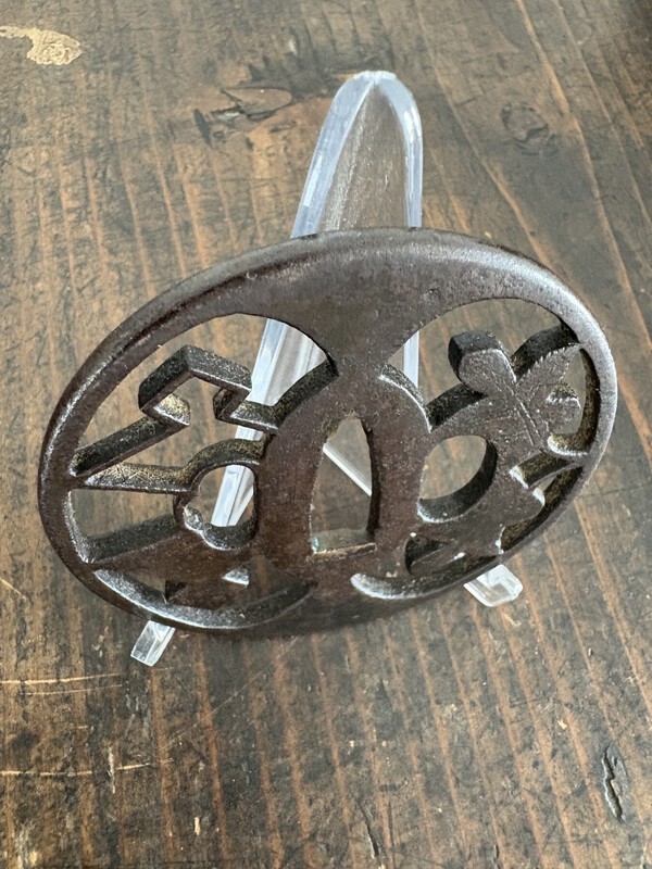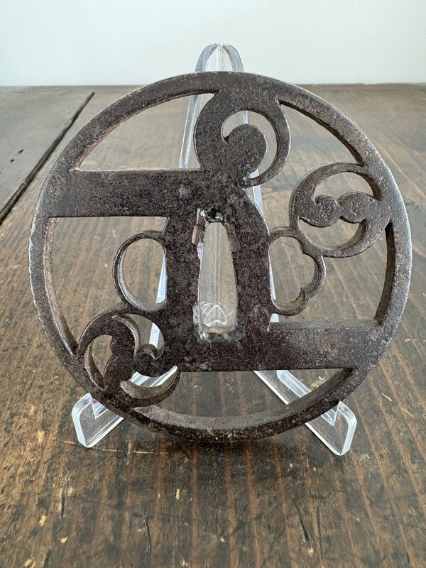 This piece is one of the highlights of my friend's collection. It is a 2nd- (or possibly 3rd-) generation Kanshiro Nishigaki sukashi tsuba, featuring a lively double tomoe-plus-kirimon motif. The shape is very appealing, I think, being that wonderfully peculiar aori-gata form that Kanshiro appeared to be quite fond of. A standout aspect of the guard is the fluid motion of the kirimon motif elements: they are not stiff and static (as they might be in a straight up-and-down posture, which is what we usually see); rather, they sweep from 6:00 on the dial toward 12:00, curving upwards through the forming of the blossoms, bringing a lot of vitality to the subject. They are juxtaposed against the negative spaces forming the double tomoe; this contrast only enhances the lively expression in this piece. I'm not even sure these are the best parts of the sword guard, though, as the metal is just superb. It is wonderfully finished, with a fine migaki-ji which nevertheless admits very subtle tsuchime. This is masterwork in tsuba finishing. The color is deep, the patina natural, clear, and glossy (as opposed to shiny). There is just the slightest hint of remaining kebori on the leaves of the kirimon. If this tsuba were larger (8 cm or more), the price would be MUCH higher for this superb tsuba. For those looking to move into higher levels of collecting, I would personally highly recommend this piece. Were I myself not so strictly focused on Owari works, I'd have bought this from my friend myself. Dimensions are 7.3 cm x 7.1 cm x 3.5mm. $1,650.00, plus shipping. PayPal Friends and Family preferred.