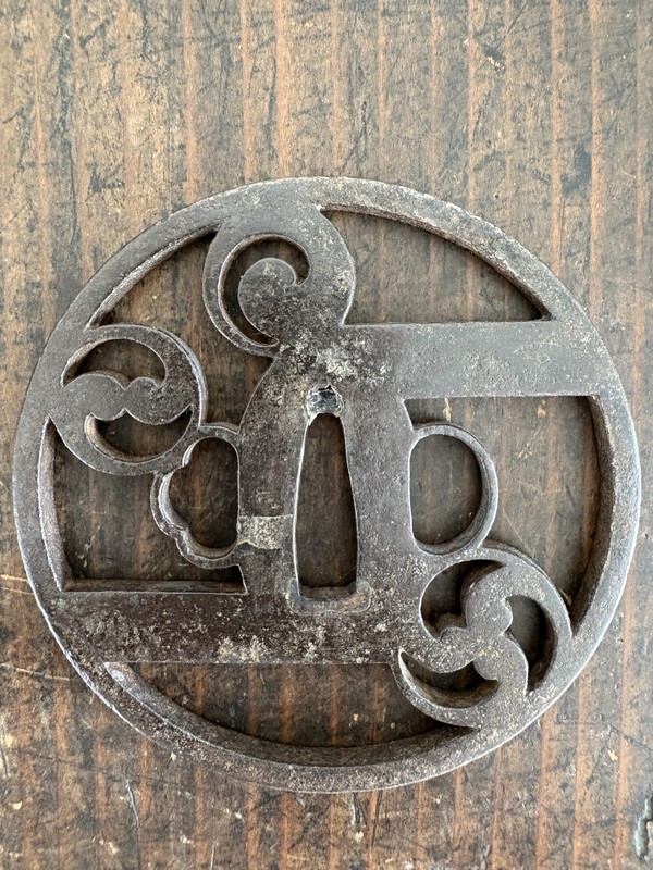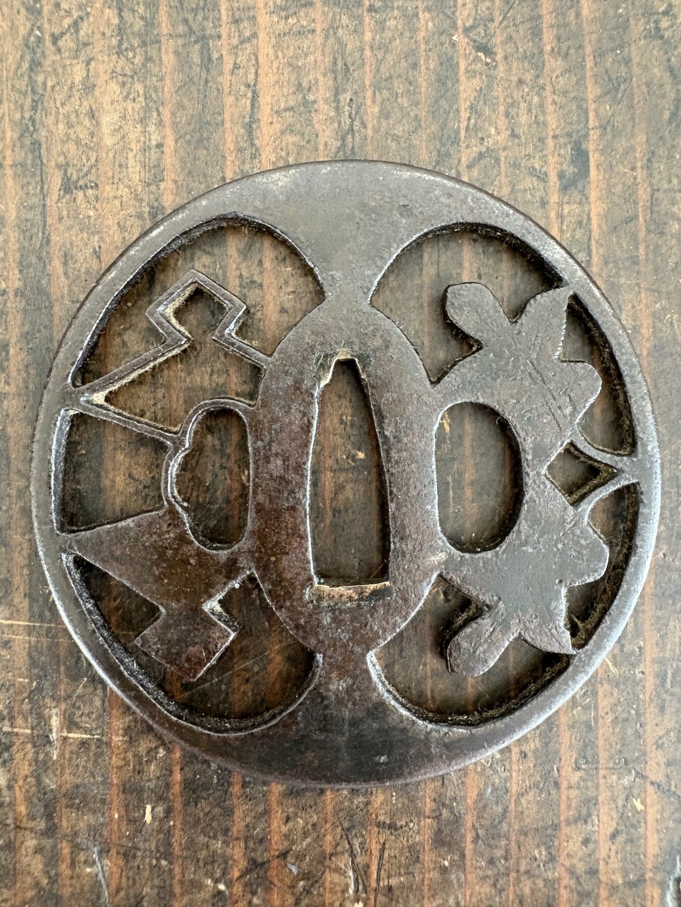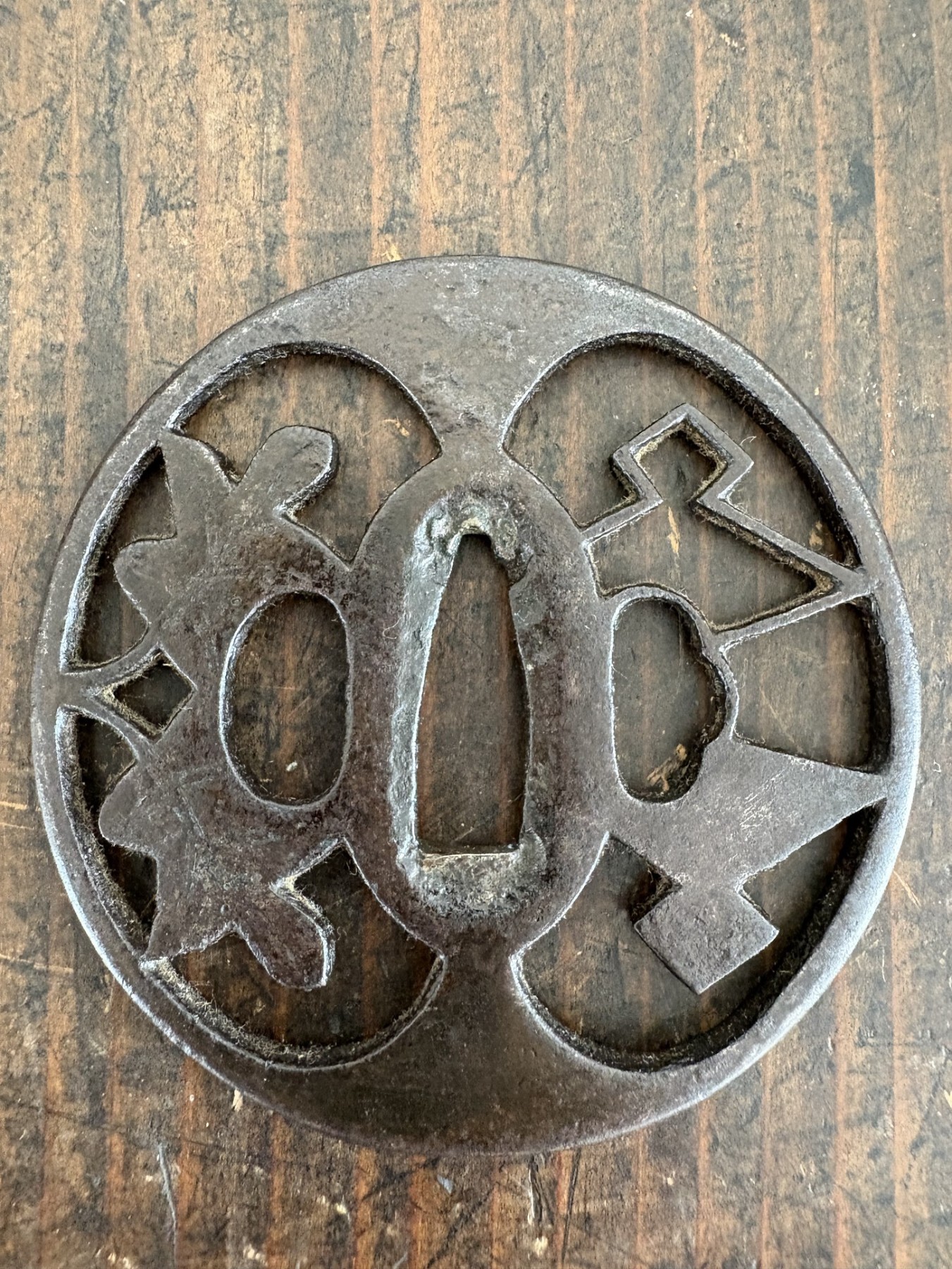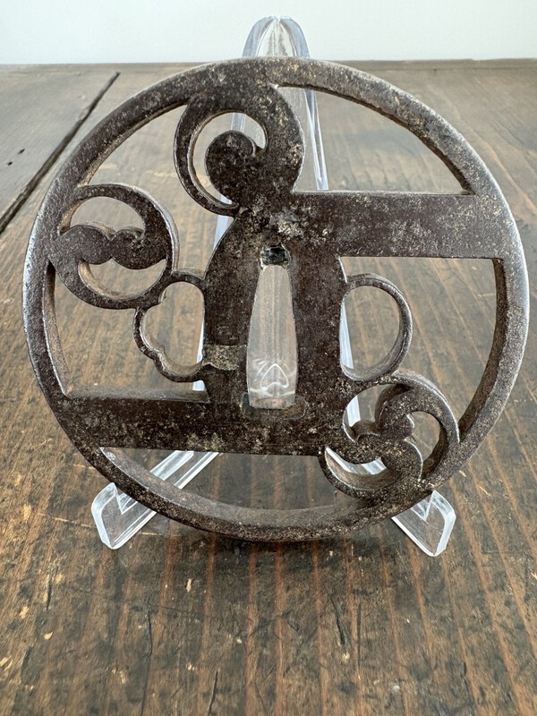 Here are two iron sukashi tsuba from my friend's collection, one an early-Edo Owari piece featuring a motif of varying tomoe and crossbars. While there are a few subtle tekkotsu in the rim, the tsuba overall presents as migaki-ji, rather than tsuchime-ji, leading me to date the tsuba to the early-Edo Period, rather than to Momoyama times. However, the large size of the guard has me thinking this could be late-Momoyama. The more conservative call, though, would be early-Edo. Dimensions are 8.4 cm x 8.4 cm x 6 mm, so, a very large ji-sukashi piece. These dimensions, in conjunction with the lively motif of the tomoe set against the solidity of the heavy crossbars, make for a bold presentation. The hitsuana are classic Owari in shape and size for the period. $285.00 plus shipping (PayPal Friends and Family). The second tsuba is likely a Shoami work (or would be likely to be categorized this way). It features a matsukawabishi motif element set against a botanical element (I cannot make out what kind of leaves these are), both set within the "namako" shaped large sukashi openings on the right and the left. With the slightly rounded rim and the particular kind of sukashi openings (namako), I would not tag this as Owari. A notable feature of the tsuba is the large nakago-ana, measuring 2.8 cm from the top to the bottom of the ana. The tsuba overall measures 7.8 cm x 7.7cm x 4 mm. $185.00 plus shipping.