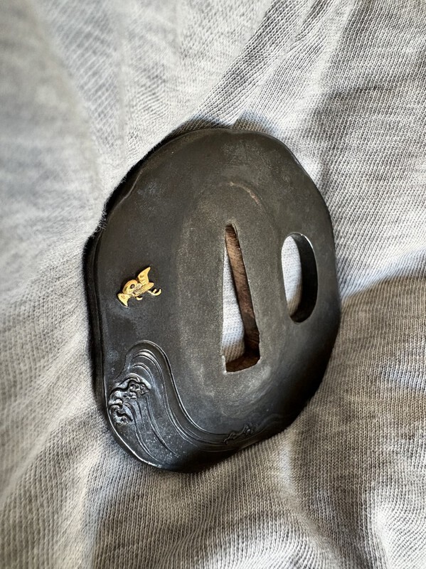 Last one for today... This is a little jewel of a tsuba, a tanto-sized piece done in what I believe is shibuich, with shakudo(?) and gold-leaf highlighting of the plovers flying about above the raging waves. The carving of the motif on this tsuba is sophisticated and very pleasing, with the plovers done in a high-relief, while the waves are rendered in a fluid and lively kebori. The tsuba measures 5.6 cm x 4.8 cm x 3 mm. It is kawari- gata (or kobushi-gata) in shape, with a rim-edge that curls up over the plate in various places around the tsuba. Seppa-zuri is clearly evident. A charming little sword guard. $275.00, plus shipping.