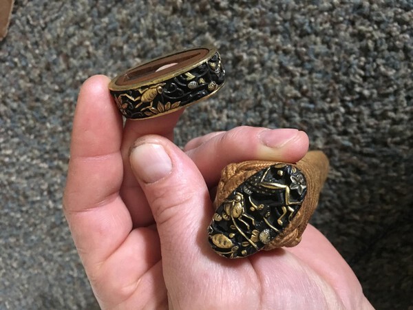 The fittings are nicely done. Maybe some cloud designs on the saya but can’t see too well. Personally I think a re-wrap wouldn’t be out of the question. You could use girls hair ties (I have daughters so I am adept at hair tie use) keep what is left together. Anybody know who could re-wrap this or what they charge? Sometimes the tsuka is damaged during a re-wrap. Hopefully the tsukamakishi wouldn’t wrap it “for battle” if the tsuka core is deteriorated badly or too old. Probably they would want to make a new tsuka.