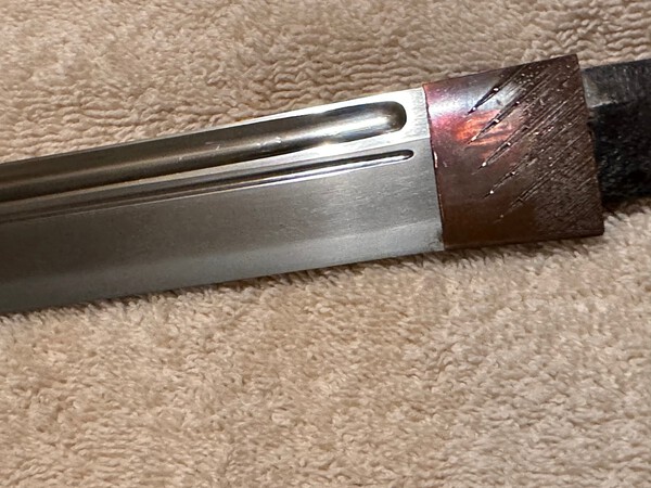 Have been collecting for about 25 years. My first sword I purchased was out of Iowa. I paid $650 for it. I sent a check in the mail for it, not knowing what I was really getting. Here is my first sword. No signature. The tang is darker than the picture, it looks black. From what I've been told the signature was cut off when the sword was shortened. The scabbard is nickel plated (I think) and the top was covered by the officer with tape to prevent shine (first pick). Gorgeous blade without any damage. Look at that beautiful tip!! Came from the family of a marine. He picked up the sword while island hopping. I believe he got it While fighting on Guadalcanal. I wanted to get with the family and get some paperwork on the Marine along with his picture to display the sword. I lost their contact information so impossible now. This is a family sword in combat configuration. Blade is 28" I've only shown this sword to one other collector, so this is the first time seen in public.