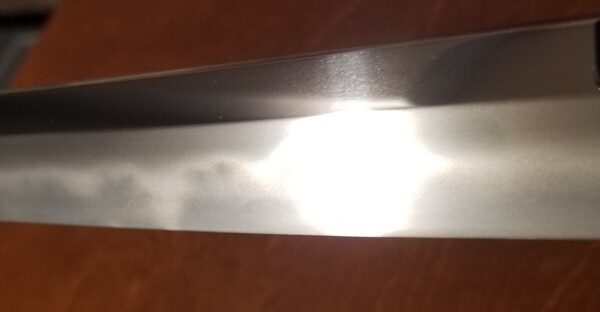 I have a gendai katana that is currently in the process of being restored. The polisher sent me this in-progress photo earlier today. Initially, I was extremely disappointed because I thought the hamon was running off of the edge, which would constitute a fatal flaw. Then again, the polisher informed me that there is nie/nioi in that area and that it was fine. So, I started to look into nie/nioi deki hamon and its structural properties... which basically tells me that what I am seeing in this photo is probably not a fatal flaw after all. Could someone with more knowledge and experience help me to better understand how I should interpret what I am seeing? Thank you!