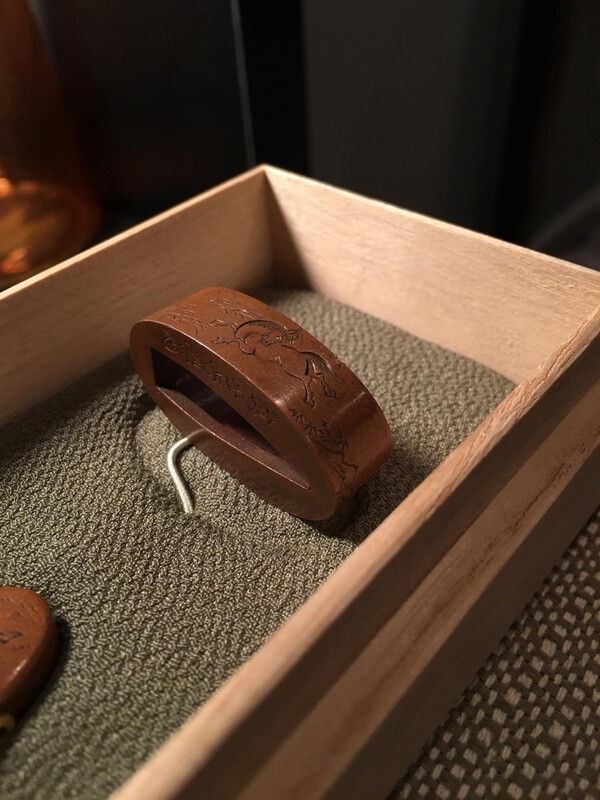 Not sure whether to put in the translation forum or not. Picked these up from Kevin Adams here on the NMB. Nice copper patina & some fine katakiri-bori work. Photos were quick snaps, don't do the set justice. Having a hard time deciphering the mei and I don't really have any references on fittings artists, so was hoping some of you all might help ID it. If not, please enjoy the pics.
