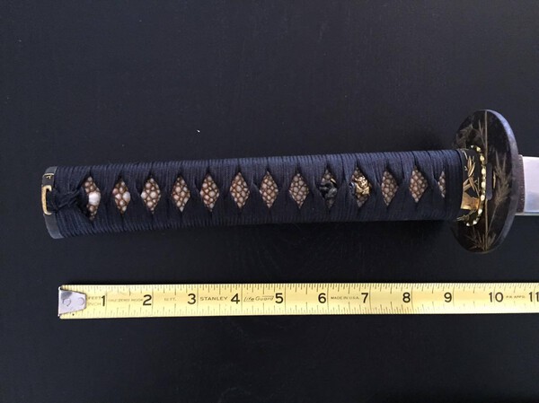 23. If you appreciate value this is one you don't want to let pass by. This is a mumei Wakizashi, it has a mizukage or re tempering. Off the bat I will be loosing money on this. The blade has what is called a mizukage or retempering that was done on it at some point. Might have been done right after it was made by the original smith who wasn't happy with the hamon or possibly done later on due to a fire. When I got this blade it was covered in a haze or rust and in WW2 mounts. Had a fresh polish put on it, and I had Wally Hostetter redo the saya, and boy did he do an amazing job; Black with gold stripes, with silver dust in the black. I told him I wanted the black to mimic the night sky with stars off in the distance, he nailed it!. I made the new tsuka for it, used left over grade #1 namikawa skin from a past project and antiqued it so it would look more age appropriate and also made a new tsuba from buffalo horn based off the shape of the military tsuba it was found in, used a fuchi and kashira that I had listed on here but had not sold, and menuki from an old beat up tsuka and put together a very nice mount to try and pay respects to the blade the best I could. I didn't have the heart to leave a blade that was still so beautiful go unfinished, I had to see this one through. Now I know I am going to loose money on this because of the mizukage, fortunately enough I have the skills and was able to do the rest of the mount myself and saved money there. I paid $300 for the blade, $900 for polish, $450 to have the original shirasaya re-done, and give or take about $275 for koshirae, that's a total of $1925 into this. Here is a link to more pictures, i forgot to take photos of the nakago, by the time i remembered it was dark out, the blade is mumei and ubu (other than mizukage) and I can get some more pictures soon of the nakago and post some measurements as well tomorrow imageshack.com/a/ynPM/1 Price is $1,500 shipped OBO (Price is VERY negotiable) Considering you can't come close to that kind of price even with a newly made custom blade in this same condition, I think this is one heck of a sweet deal. I have a car I would like to purchase this week, IF you like this make me an offer, no reasonable offer will be refused, the faster this sale the better, I'm prepared to loose money already If you have any interest please let me know, Thanks, Sal