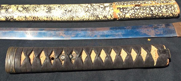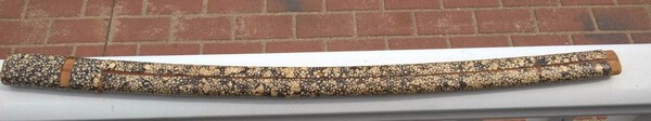 22. -Thanks Tokashikibob!!! I use my own concoction of different things to age the samegawa, but coffee is not one of them PM if you want more detail on the process -At the Tampa show it failed Shinsa due to the saiha, I have the paper from them still. I'll have pictures of the nakago and measurements in just a short while after I finish my morning coffee Thanks, Sal