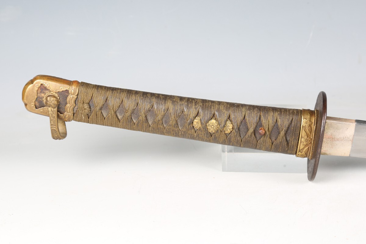 Here's one of those puzzling ones. Found on this Toovey's Auction. Mumei, no observable stamp, #65. Fittings are typical Army, but hey are not gold gilded. Most puzzling is the tsuka ito which clearly had been handled/carried considerably, look at the sweat stains. Adding to the list of souvenirs with sarute ... and this one is a bit unusual. -