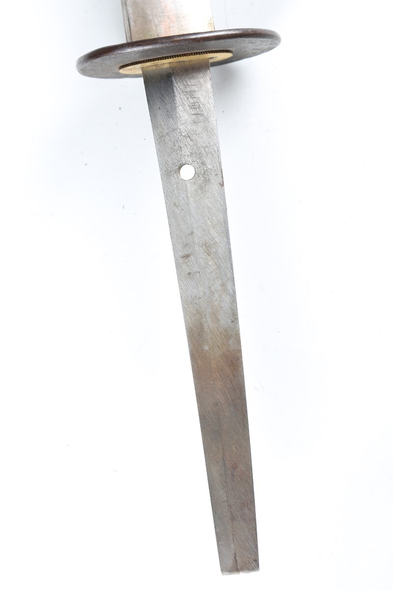 Plimpton called your version an "early model" of the Type 8 Dress Sword. Most version have more detail on the little curly thingy off the front end of the guard: While most saya (scabbards) were chromed, we have seen several come through with a darkened finish to them. Hard to say with yours with all the corrosion.