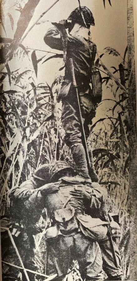 I know that shadowing and the fact that it's a black & white photo could be falsely giving the impression, but this could be a black painted saya. It's clearly a Type 95, steel tsuba (sorry Sam, no numbers, Ha!):