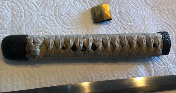 Dave, that ito reminds me of a Rinji I just saw. It was almost colorless, tan, and quite course. Here's a picture. The seller said the fuchi was a reproduction replacement but claimed the rest was original. -