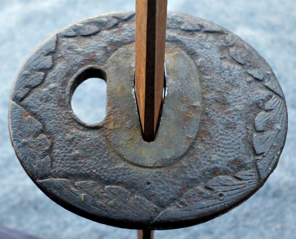 The blade is, as you can see, well out of polish and has been abused in the past. Nothing is beyond the skills of a good togishi to repair, and it is my sincere hope that, should this sword be worthy of the expense of a full and proper repair and polish, that is the route I would like to go with this. Even in it's poor condition it is still extremely sharp! I also would like help with the tsuba and fuchi, because if the blade/swordsmith be identified and deemed worthy of consideration for a polish, I am sure the fittings will be sold separately and the new owner of the blade would like to have fittings of their own properly installed.