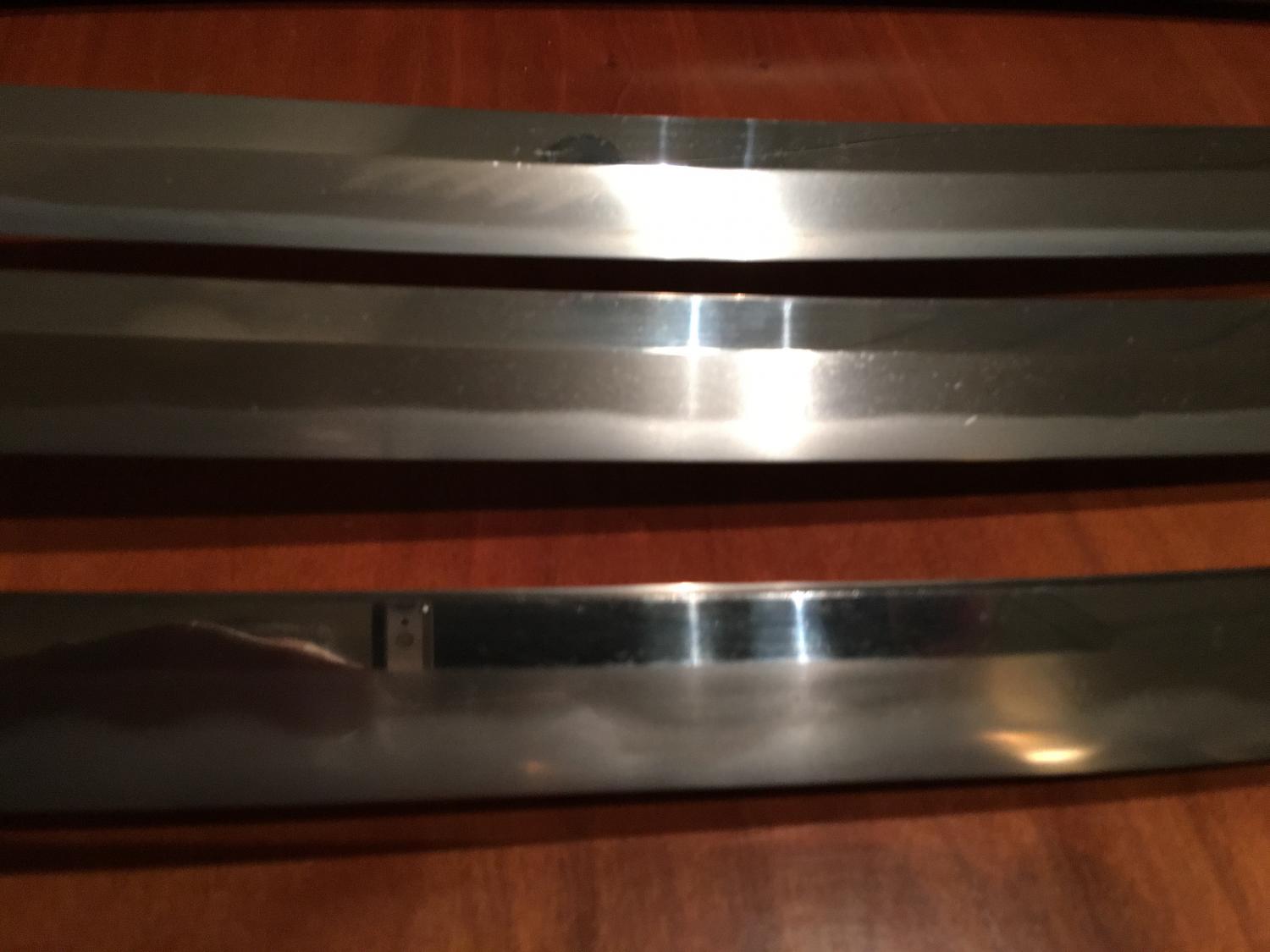 Once gain, I thank all the minds on the board and the NY token Kai for the wonderful guidance in buidling my collection. I feel like I have learned so much yet barely scratched the surface of this addiction. In my desire for the Old I am proud to present for your consideration and review my first Tokubetsu Hozon piece a Likely early Muromachi Mumei O-suriage Shikkake Katana. Also, and although this likely only benefits me as a learning tool, I decided to add photos of the sword itself and direct comparisons to my Koto Kiyomitsu and Shinto Kanemichi. What stikes me about the Yamato Shikkake is the thinness of the blade and the tapering lines up to the kissaki when compared to the much meatier Koto and Shinto blades. I see how the hada also changes along the blade as you move to the nakago. I hope I have done well with this but I am very pleased to be able to look at such an old blade in such nice condition and imagine where it has been. For reference the photos with three blades starts with the Shikkake furthest to the back of the photo, then the Koto and closest is the shinto wakizashi. In the photos where there are two blades it is the Shikkake furthest and the Koto Kiyomitsu closest. I can also say that the 2 piece habaki is beautiful for such a simple part. Just wish I had mounts for this. No swords with mounts yet. To all the more informed, I do realize that I am comparing a very old Tokubetsu Hozon piece to a more run of the mill Hozon Koto and nice Hozon shinto blade. This was a pleasurable learning experience. Thanks, Darius