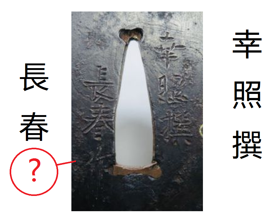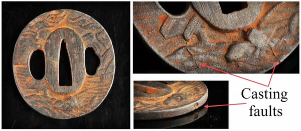 Yes sorry, Grey is correct, that tsuba was mass produced - they come in two sizes, with either cast in tagane-ato marks [see red arrows] or plain. A great number are "signed" but a few are not. Unfortunately yours has extra faults both sides top of the seppa-dai and either a cracked mimi at the bottom, casting fault or corrosion damage. It is an interesting fact that even cast tsuba came out of the factory in different 'grades'. I have seen a few so bad it is near impossible to see any details at all, I can only guess they didn't go back into the melting pot because they looked incredibly 'aged' or dug up from a battlefield and were probably sold on as such. No great drama you can always put a better guard on the koshirae and perhaps have the bonus of an interesting talking point or paperweight?