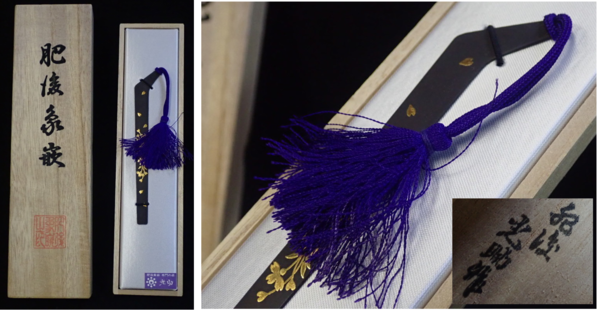 Piers: Not sure if this will help - also listed on - https://buyee.jp/item/yahoo/auction/h1033077981 肥後 象嵌 光助作 未使用品 美品 共箱入りサイズ:全長12.3cm 巾2.3cm 素人採寸に付、若干の誤差はあるかもしれません。 I thought it may be a kozuka but I couldn't work out why it had that bent angle end and tassel? The images don't help much with the other end, is it open or closed? Can you fit a blade to the 'handle' - just odd [and I do like odd!]