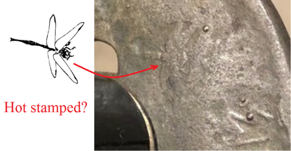 Tenpo/Tempo/Tembo - various spellings - 天保. Or Saotome with 'hot stamped' Tonbo [dragonfly]. Difficult to make out but definitely there. Unsure of the ten-zogan, is the image overexposed? Could be silver inlay? Very fine dots and rather sparse.