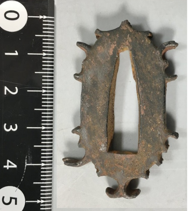 https://www.jauce.com/auction/v1012097670 Johan you are correct the Tachi was still worn at the imperial court right up till the Meiji period as 'formal' attire. Do you only have the one O-seppa? normally one either side of the tsuba. With most other tsuba you would display in the position of the first image you posted but being Tachi they were worn 'upside down' as in the last image. From what little I know the leather used was either horse hide or buffalo and most often in up to six layers glued together with the grain being alternately placed. Many had a thin metal plate within the layers for strength and usually had a fukurin securing the outside edges. Unfortunately leather does not last very well over time and very few intact pieces remain. Example of delaminating leather tsuba http://i.imgur.com/BVqw9DD.jpg I see partial remains of a fukurin on your piece and some gilding to the leather still remains on one face, but time is not kind to the leather. There is another discussion on Nerikawa tsuba here:
