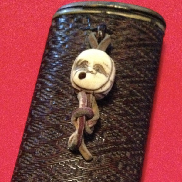 4. Thread your doubled cord through about 20 eyelets in the leather. This is a fiddly job requiring all kinds of useful tools, and plenty of free time and patience. 5. Somehow get the loop and the two loose ends to all go through the ojime. (Note that many beads will look like ojime, but the central channel of a typical ojime is usually larger than most ordinary beads.) 6. Final result with new black cord. Jabara concertina mouth pulled shut with tightly fitting ojime.