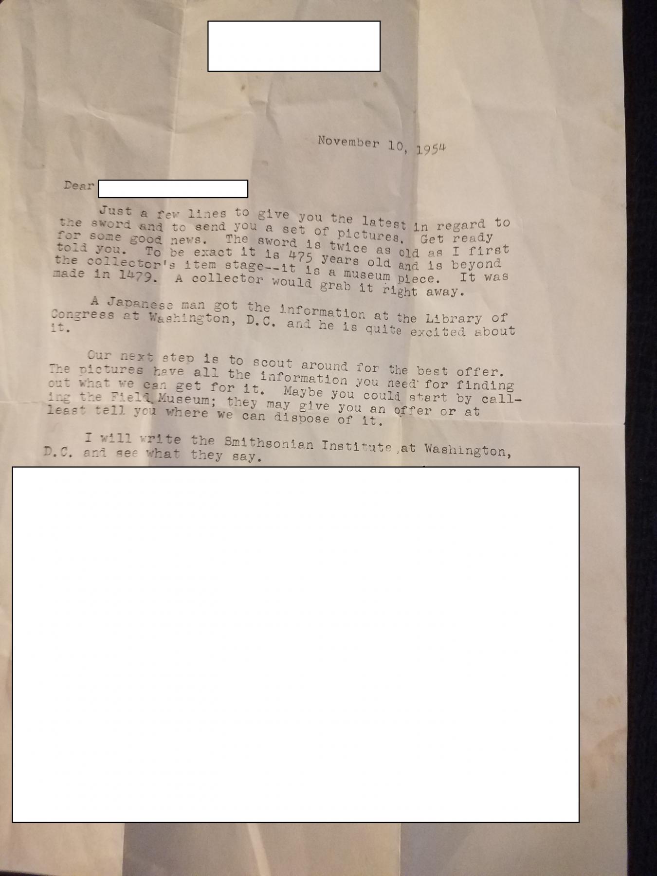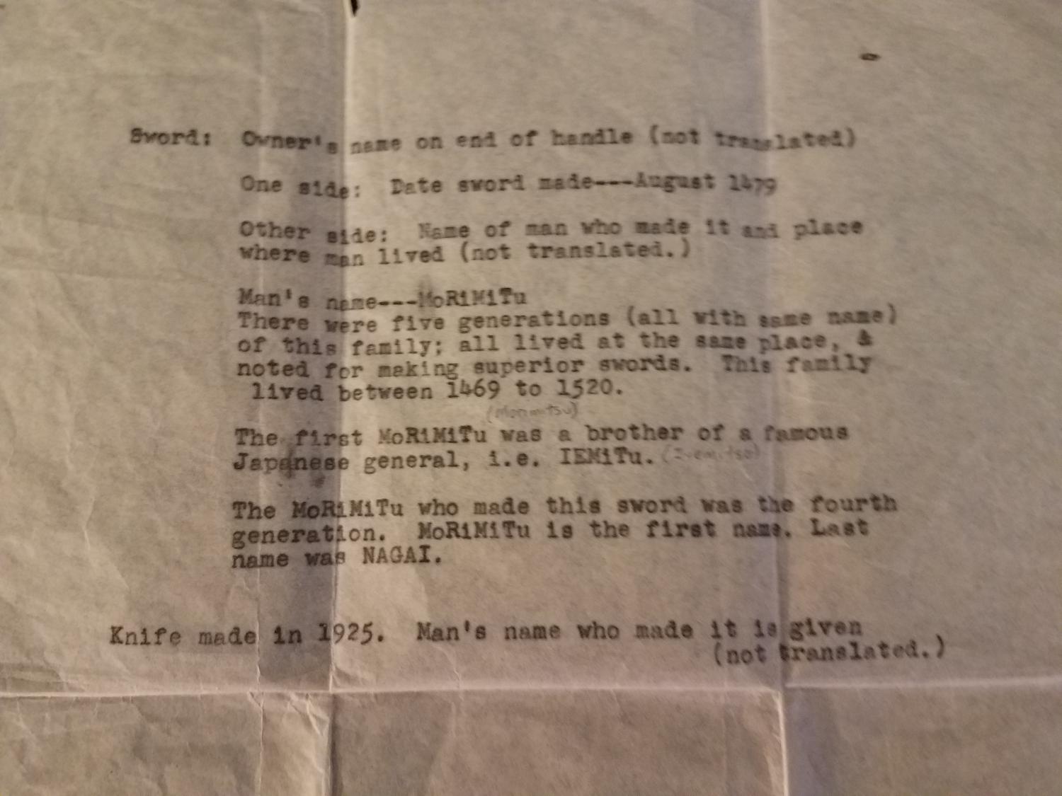 First story behind this sword... My uncle served in US army ww2. Mostly he didn't talk about it. A few years ago he began to open up about his experiences, but not all. We knew at some point during the war or after it when he served in Japan he somehow acquired a sword. Sadly he passed before he got the chance to tell us. With the sword there was some paperwork. Back in 1954 apparently he was thinking of selling it and had a friend of his do some research on it. The results appear to have been spectacular. I know nothing of samurai swords or anything about his friend who did the research or translation. I have found out there are a lot of fakes. My questions are is it real or at least appear authentic? Can anyone confirm the translation from 1954 correct and complete? Can anyone provide more information than what has been provided? How much do you think its worth and do you think I should get it professionally appraised? Personal information I have removed from 1 of the letters.