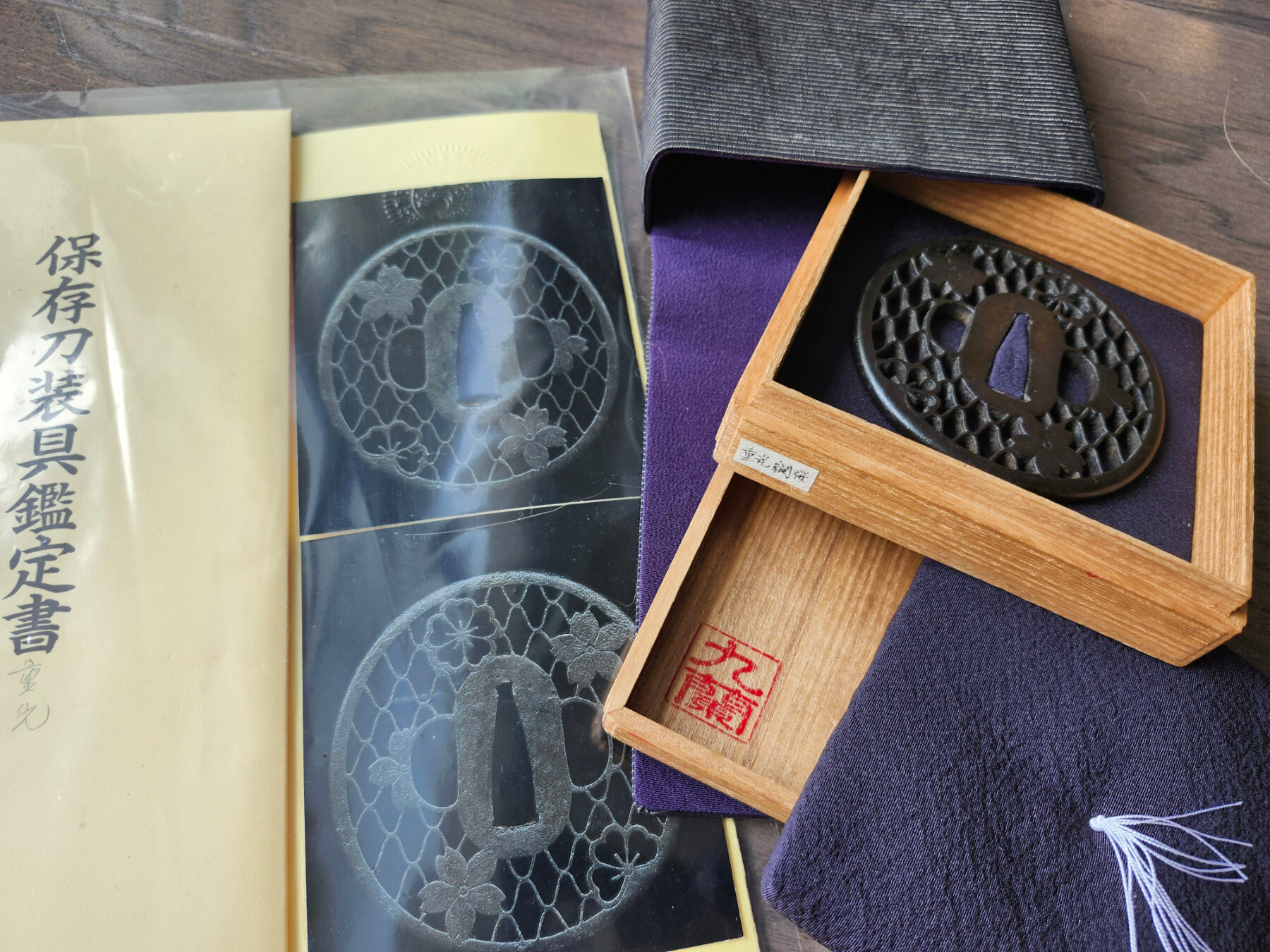 Hozon Hayashi Shigemitsu for $4750 https://irontsuba.com/shop Not Higo, not Hayashi. Direct Hozon to Hayashi Shigemitsu. Theme is Yoshinogawa [Sakura in the River Nets]. Ex-Ito-san. More pictures to follow. Please contact via email at my site. Nidai Yamakicihibei, Kanayama, Tokugawa Ono, and my favorite Kyo-Sukashi to follow later.