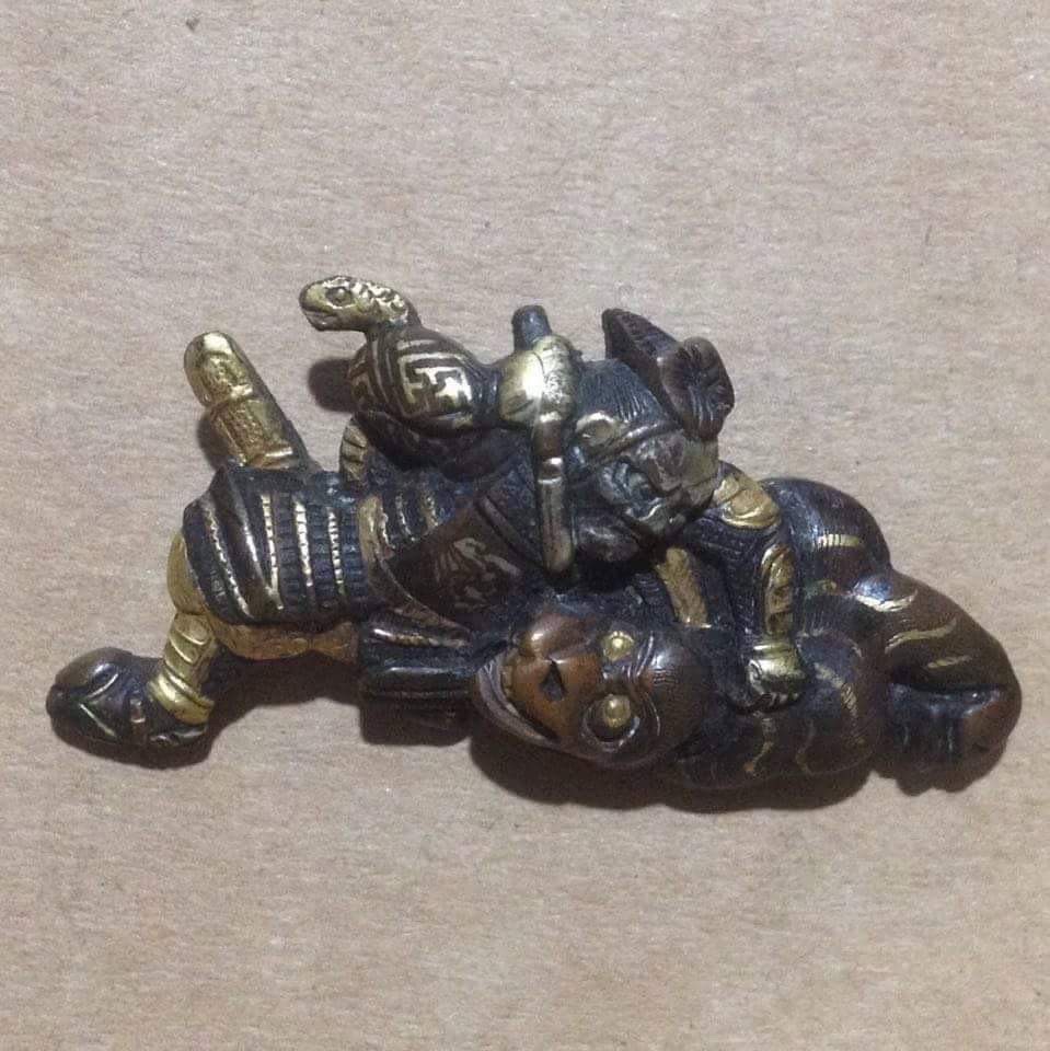 This piece was given to him by his uncle, who was an Australian soldier in the pacific campaign of ww2. He was captured by the Japanese, and was a prisoner of war in Changi. One of the Japanese officers who was responsible for executions, would use his personal sword on the prisoners. As the camp was liberated this officer met his end by my father in laws uncle and his fellow soldiers. His friends and him decided to pull the weapon apart and take small pieces back home with them. He took the menuki, there was a second piece but my father in law can't find it at this stage. Is there anybody here that could help identify this piece? It's a very nice piece in my unprofessional opinion, and would love to give my father in law some more information on it!