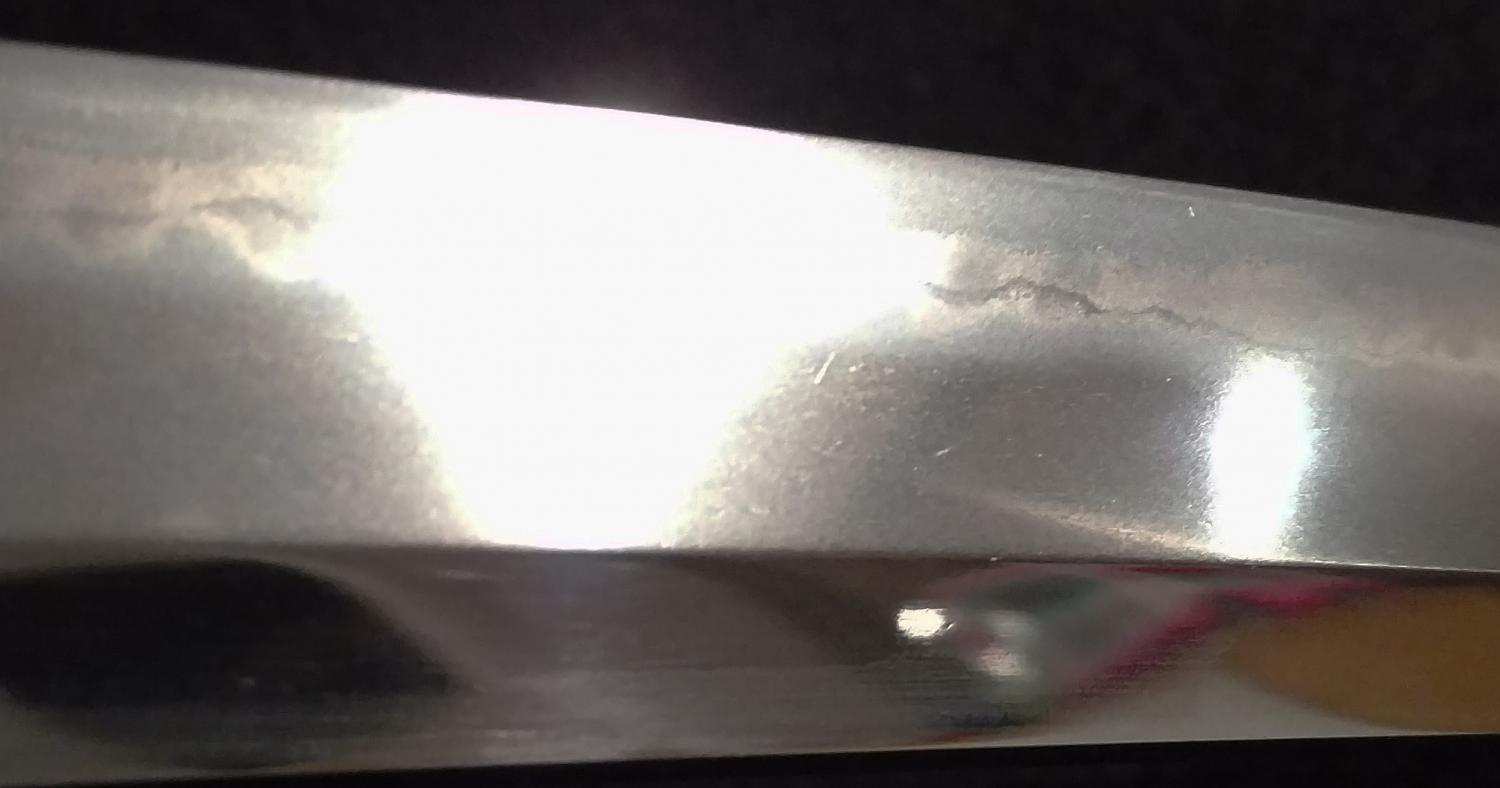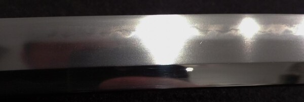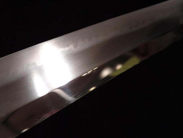 Kamakura, Ko-Aoe. I would like to research a bit more, but my initial feeling is Ko-Aoe Masatsune (Senoo), with a fallback to Ko-Aoe Moritsugu. I need to see if I can locate the Masatsune oshigata this reminds me of. Also note that both Moritsugu and Masatsune signed tachi-mei in contradiction to what is typical for their kei. The way I understand the term Dan-utsuri refers to the utsuri being a layered combination of types, for example both bo utsuri and midare utsuri appearing in places on the same sword. While the utsuri pattern takes on more of a bo (straight) tone towards the habaki-moto, this is happening in the same area where the hamon seems to degrade and eventually fades out in a yaki-otoshi. My impression is that this was a continuous midare utsuri when the sword was healthy, and would not describe what I see as dan-utsuri. If anything that area at the habaki-moto seems have a more tsukare-utsuri as it is connected with tiredness in the sword.