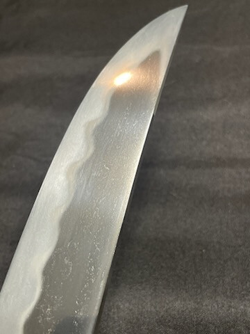 The Muromachi period is 1336 to 1573. Kirill believes it belongs to the Bizen school, which is one of the five major blacksmithing traditions in Japan. Kaga is a minor school, which does not belong to any of the five large schools. Utsuri is a secondary shadowy "hamon" that follows above the hamon itself and is usually a key point in attributing it to Bizen school in the Muromachi period typically. The hamon is the temperline that you're seeing on the body of the blade. It represents the hardened portion of the blade itself, from the edge to the wavy pattern you see in the body of the blade. The nakago reminds me of Kaga school blades, so my initial impression is that this is one of those.