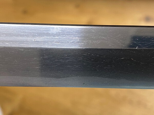 Thanks to all who had replied after my post. Attached a picture from above with markup. Note how perfectly smooth the surface in this area is, the first and very few file streaks become visible at height of first hole. Wouldn't this be a sign that it formerly was polished in this area and the blade originally was much longer? Secondly, I marked (or at least tried to mark) the line I was able to see .. it seems to extend back. Or do I see something wrong? I'll be shipping the blade out for evaluation tomorrow. Hopefully I'll get feedback soon and of course will share it in here. Finally and just to have it mentioned: it would had been easier if some in here had told me what to do to make a possible hamon visible. If it hadn't been for Kevin who told me what I should do, I would had put the blade aside as it is and made it a time capsule again. A bit frustrating for a beginner to only be told what it could be, but not what is needed to be able to find out more on it. I'm not here to only get opinions for free and sell at a profit (btw just to have it mentioned again and make it very clear: I'll not be selling!) based on the information I was given. I appreciate the opinions, but my goal is to learn based on an own blade, for maybe in a few decades to be able to tell this myself. PS: Tom Darling, while I did understand most of the posts in here, I honestly have no clue at all what you want to tell me (or others) with your single line posts. Maybe you could get a bit more in detail because I'm not a native speaker either and I'm not sure if you sometimes are being sarcastic or if your posts are directed at me or others. Thanks!