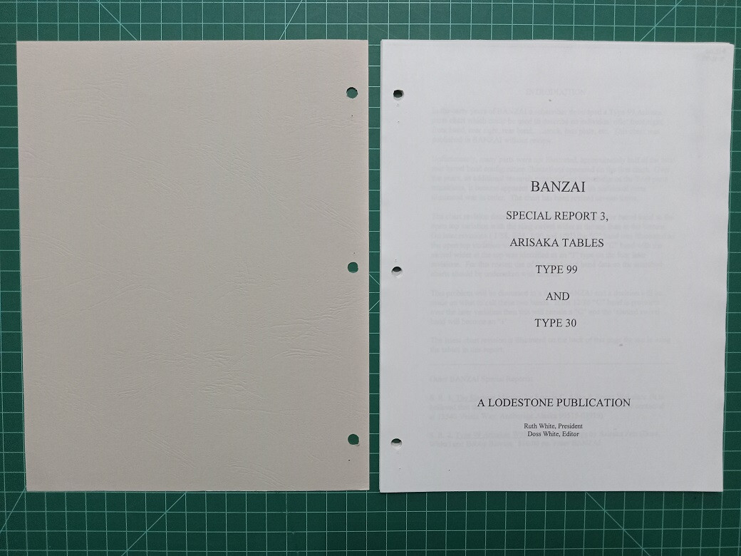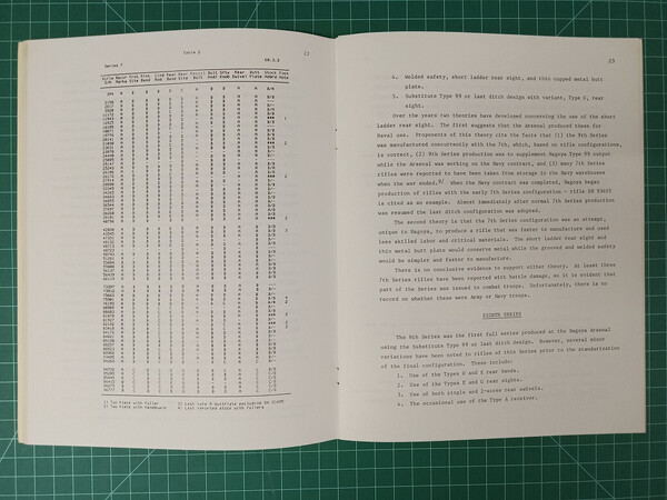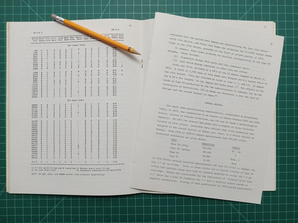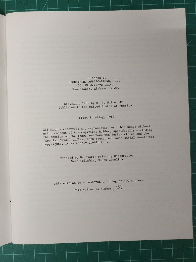 Japanese Type 99 7.7mm Rifles Both books sold together for US$99 including shipping to the United States. White, Doss H., Bill S. White, Frank A. Knapp, and George H. Taylor. The Japanese Type 99 Arisaka Short Rifle. Shoestring Publications, Ltd., 1985. Autographed by Doss White (AKA Arisaka Fats). First edition, first printing. Copy 291 of 300. Beige softcover, centerfold stapled, 8.5 x 10.5 inches, 80 pages, text, charts, tables, no pictures. Weight: 0 lb 8 oz, printed in United States. The cover is detached from the top staple while the center sheet is loose. See pictures below. This was the forerunner of the Banzai Special Projects. With the updated tables sold in combination, still a useful book for collectors. Purchased this directly from Doss back in 1991. Team Arisaka. Arisakas Tables: Type 99 and Type 30. Banzai Special Report 3. Lodestone Publication, 1999. Softcover, 8.5 x 11 inches, 46 pages, tables, no illustrations. The side-stapled binding converted to 3-ring binding. Weight 0 lb 5 oz, printed in USA. Anyone who contributed rifle data was considered a member of "Team Arisaka." This is a spreadsheet showing the changes in component parts. The two publications above are sold together and the total cost for both is US$99 including shipping to US.
