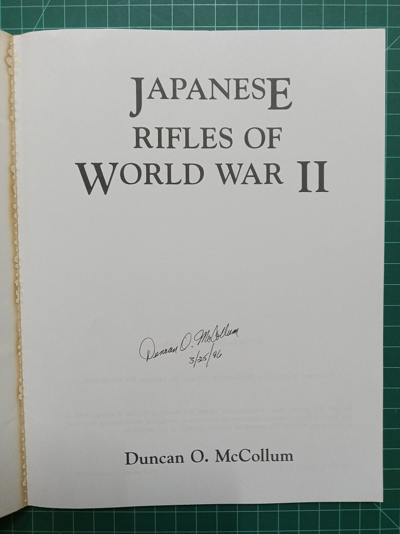 Japanese Rifles The books below cover Japanese rifles in both 6.5mm & 7.7mm caliber. All three Japanese rifle books below for US$150 including shipping to US. Honeycutt, Fred L., Jr., and F. Patt Anthony. Military Rifles of Japan, 1897–1945. Honeycutt, 1977. First edition, used, dust jacket, red hardcover, 6.25 x 9.25 inches, 224 pages, black & white illustrations. Weight 1 lb 6 oz, printed in USA. Comes with the letter from the author that was included with the book. This was the first book devoted to just Japanese rifles. Some of the pictures are larger than the later editions. Has a chapter on bayonets. I recommend having this book if one is an advanced Japanese militaria collector. US$80. McCollum, Duncan O. Japanese Rifles of World War II. Excalibur Publications, 1996. Autographed by author. First edition, first printing. Softcover, 8.5 x 11 inches, 64 pages, black & white illustrations. Weight 0 lb 8 oz, printed in USA. A nice little primer on Japanese rifles. US$30. Team Arisaka, Victor Soto, and Linda Soto. Articles from Banzai on The Japanese Sniper Rifle with Sniper Rifle Serial Number and Telescopic Sight Manufacturer Tables. Banzai Special Project No. 7. Lodestone Publications, Inc., 2001. First edition, first printing. Softcover, unbound, 8.5 x 11 inches, 50 pages, tables, black & white. The comb binding converted to 3-ring binding. Weight 0 lb. 7 oz., printed in USA. This was the first Banzai project on snipers. US$50.