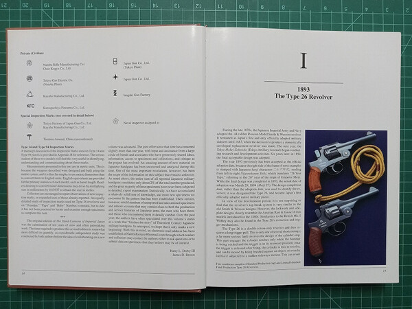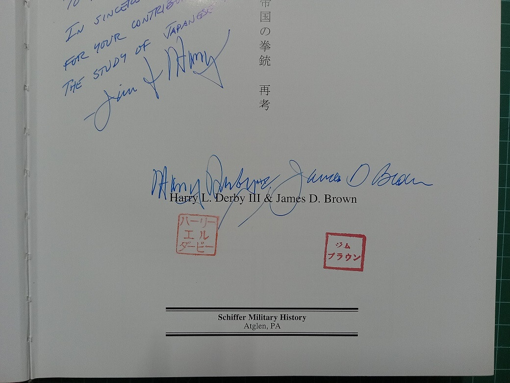 Japanese Handguns There are two editions of the Derby & Brown handgun book, the original edition from 1981 and a later revised edition from 2003. I find the older edition easier to read while the newer edition has some color pictures. I strongly recommend that gunto collectors have a copy of at least one of these books on the bookshelf. Price for both books is US$160 including shipping to the US. Derby, Harry. The Hand Cannons of Imperial Japan. Charlotte, N.C.: Derby Publishing Company, 1981. Stamped and autographed by author. Hardcover, 8.5 x 11 inches, 284 pages, drawings, tables, black & white illustrations with 8-page color insert. The back endpaper/flysheet has completely split at the fold and is only held together by the fabric backing. As the book is damaged, it is no longer a collectors book but merely a reading copy. US$40 including shipping to US. Derby, Harry L., III, and James D. Brown. Japanese Military Cartridge Handguns, 1893–1945. Schiffer Military History, 2003. Stamped & autographed by both authors. Dust jacket, hardcover, 8.5 x 11 inches, 384 pages, color illustrations. Weight 5 lb 0 oz, printed in China. The book is currently out of print and the senior author has passed away. This particular book is a contributor's copy. All that means is that I was given a courtesy copy because of my contributions. That is the reason it is signed and stamped by both authors. US$140 including shipping to US.