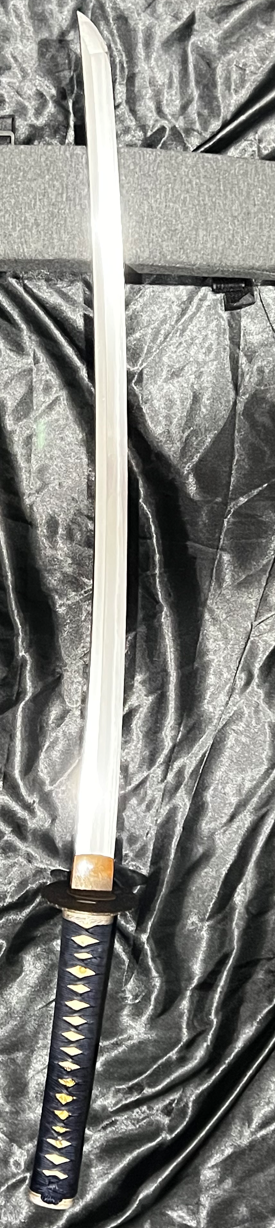 For Sale – Traditionally Forged Gendaitō by Sadatsugu A WWII gendaito Price: USD 2,200 / EUR 1,920 plus shipping and PayPal fees Presented in a black gloss lacquer saya, and also fitted with an iai koshirae, this is an attractive and substantial traditionally forged gendaitō by Sadatsugu, signed on both sides of the tang. This is a high-grade traditionally forged blade, showing no forging flaws or kitae-ware, and no kizu on either side. It is a healthy, honest gendaitō with very good overall quality, combining strong workmanship, a beautifully cut signature, and an unusual dated inscription that makes it all the more appealing. The mei is deeply and beautifully chiseled by Sadatsugu, with confident strokes and excellent balance. The long inscription reads: 濃州関住人美濃守源貞継謹作 Noshu Seki-jūnin Mino no Kami Minamoto Sadatsugu Kin saku (Gifu) Dated: 昭和十六年極月 Shōwa 16, Gokugetsu December 1941 A particularly attractive detail is the use of 極月 (gokugetsu), an uncommon and more literary way of referring to the last month of the year, rather than using a standard numbered month inscription. This gives the tang an added level of character and makes the date inscription more memorable than the usual wartime examples. The long mei ends in 謹作 (kin saku), which may be understood as “carefully made” or “respectfully made.” On a well-forged nihontō, this has a more deliberate and dignified nuance than a simple saku, suggesting a conscientious and especially careful piece rather than a routine signature. Measurements Nagasa: 67 cm Sori: 1.6 cm Motohaba: 3.2 cm Sakihaba: 2.1 cm This is a hon-zukuri, iori-mune blade with ubu nakago, and it has an appealing, practical sugata with a good balance of width and taper. The jigane is a well-forged tight ko-itame hada. There is ji-nie, with fine chikei visible in the surface, together with a faint pale utsuri-like appearance. These details confirm that this is not a mass-produced showatō, but a genuinely forged traditional blade with visible craftsmanship. The hamon is essentially suguha-based, with a shallow notare movement mixed with gunome. The nioiguchi is bright, indicating the quality of the sword and the skills of the swordsmith. Sadatsugu was a Seki military swordsmith, and I have not seen postwar work by him. This piece appears to be an especially careful work and the quality is clearly above the more routine wartime output often encountered. For collectors looking for a genuine traditionally forged wartime blade with a proper mei, healthy condition, and good visible activity, this is a very appealing example. Looking at the nakago and mei, the workmanship is fully in keeping with authentic Shōwa-period gendaitō. The chisel work is deep, clean, and confident, with even spacing and a natural flow to the characters, rather than the appearance of a later-added or amateur inscription. The nakago shape, yasurime, and patina are all consistent with the period, and the blade and tang are in very good harmony overall. In addition to the blade itself, the inclusion of both a black gloss lacquer koshirae and an iai koshirae adds practical and display value. It can be appreciated both as a collectible wartime traditionally forged sword and as a piece that presents well as a complete item. Overall, this is a healthy, traditionally forged, signed gendaitō with: an attractive and fully cut long mei on both sides a rare and memorable gokugetsu date inscription a desirable kin saku ending visible hada no forging flaws or obvious condition concerns A very good opportunity to acquire a genuine signed wartime gendaitō with character and quality at a reasonable price. Price: USD 2,200 / EUR 1,920 Plus shipping and PayPal fees