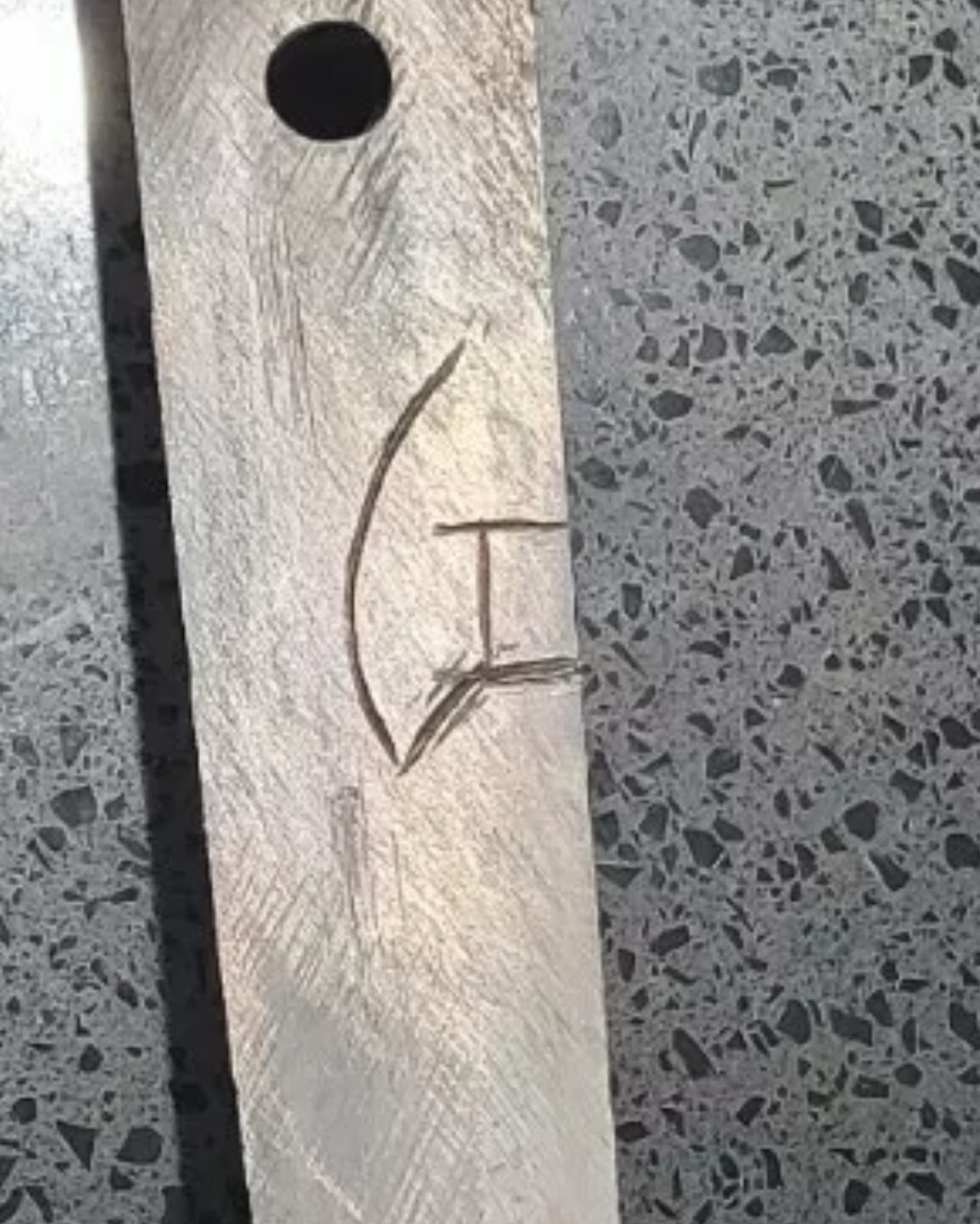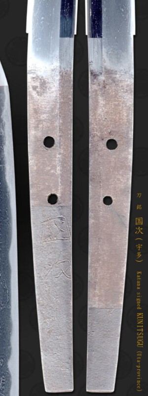 I'm a huge fan of the urushi lacquered bohi on blades even in the face of the thought that they are sometimes done to hide defects. The potential shinto and religious/cultural aspect of doing it adds another dimension to a blade. The philosophy behind battle/war and even life/death/killing is another road of thought and interpretation in nihonto that is very interesting for me to learn/think about. I see a shimmer of philosophy in that urushi. So even if it was simply done to hide a flaw, for me, it still helps to inspire some other thoughts surrounding our hobby. Plus I just think they look real cool =|:^) Also hoping the mei looks authentic and from the one other comparative blade I've seen there is a shot. I attached the other papered blades mei below.