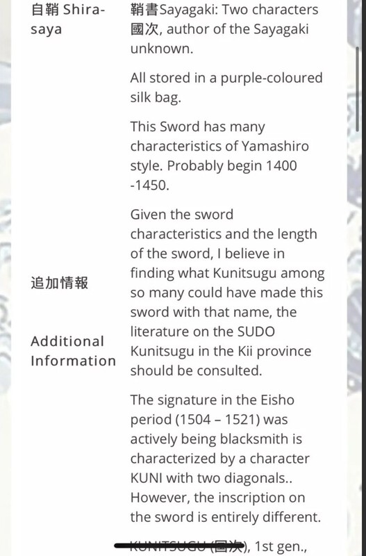 Sunny, yeah, I almost left it alone too until I had a conversation with the seller and him having no reviews didn't help anything either. Ebay buyer protections emboldened me and wasn't convinced it was all legitimate until I got it in hand and took it out of shirasaya. I got a different story on how he acquired it so potentially Egbert got it at the auction and then sold it to him or it was just talk. Either way I'm happy with it and the price I paid as I really don't seem to run into signed katana length blades like this very often at all. I see more wakizashi with lacquer bohi which also don't seem that common and most lacquered bohi blades I've seen are Edo period. Wont lie, I'm a sucker for them and now have 2 katana and 1 wakizashi (wak has the exact same bohi designs as this katana). Dream acquisition would be a signed o-kissaki red lacquered naginata-hi katana with 27/28" nagasa. The double edged sword of these are it's a niche blade type and many collectors may be hesitant to buy one due to potential hidden flaws/aesthetics etc..