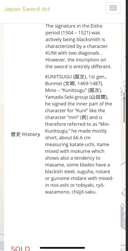Purchased this blade to match a wakizashi I have with the same red urushi bohis for a personal daisho side quest. Only history I was given from the previous owner about this sword was purchased from Egbert Menzinga of The Hague many years ago (maybe a known collector?) And the sword info he shared on the blade was from Japan sword art. I'll post the information below I was given on the blade itself which has no papers so authenticity is unverified and I'd love any opinions. Kunitsugu 1st generation Bunmei period 1469 to 1486 ca 1470 Mino province yamada seki group Teacher:Norizane Nagasa 65 cm Sori 2.05 Motohaba 2.84 Sakihaba 1.81 Kasane .81 Nakago 15.2 More details in photos below. Please let me know if any additional photos would be helpful.
