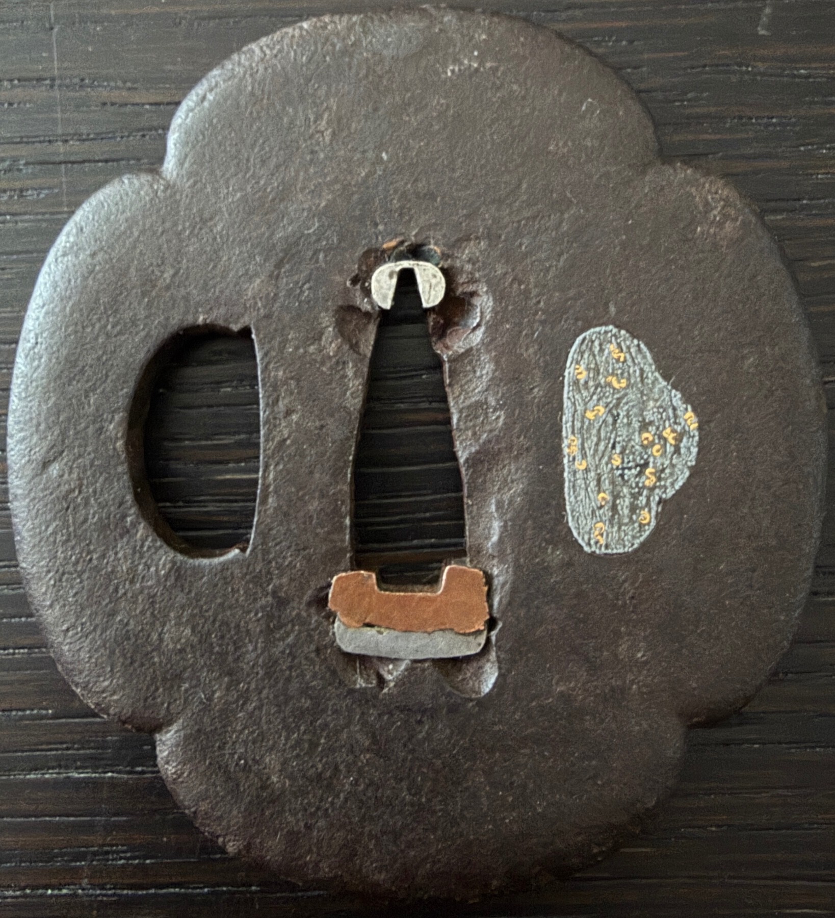 I picked this tsuba up a while ago. My first one. Its simplicity and 'honesty' appealed to me and that it was mounted at least 2 times. Apart from the mokko gata shape the only other adornment is quite an intricately designed and execution of gold inlay in the filled hitsu-ana. The vertical lines scored in the material (I assume its lead alloy) are reminiscent of stems and the gold representing the flower heads eg iris. Could this embellishment have been added at a later date? Any ideas regarding period and maker/school?