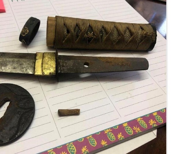 I just got another Kai-Gunto that made me question the Seppa on both sides of the Tshuba and O seppa, because the color on finished side, was not "gold" as much as a pale almost mustard yellow color. Same piece on my other good but not as good sword, looks like most worn gold plated brass fittings do. Only thing I can attribute it to is not seeing light for a long time. The rest of the sword checks out .. al s/n matching, good file marks, etc. Will post more side by side comparison picture, see one on left. Just wondering.