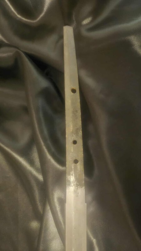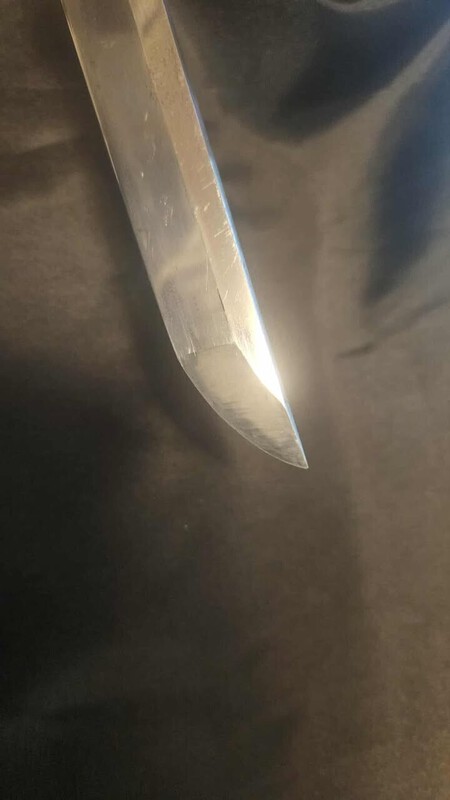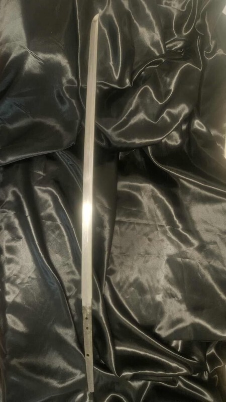 so guys a odd ball late shinshinto loyalist sword in need of polish and habaki a huge piece, like a clothes rod. nagasa 740mm total is 997mm kasane at habaki is 7mm and at kissaki is 5mm mihaba at habaki is 29mm and a kissaki is 5mm sori is less then 9mm there are no bends, or chips or pitting, the yokote has be chaffed. chu kissaki and the blade has been steel wooled so no features but no ware either. signed is jibberish but ubu and had the machi moved up this thumping great thing has a very odd mitsu mune for a late peice. serious sword need a restoration but im pooling my money for something juyo. so priced to reflect the restoration price is 850 usd plus postage