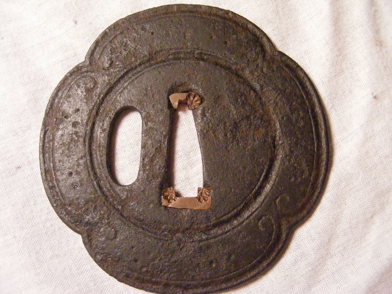 Hello gentlemen, here is a showa tsuba I have, that at some point somebody tried to clean one side of for some silly reason. the aged patina looked nice for a showa piece so why remove it??? look closely and it has some forging marks so, I don't think its a run of the mill pressed tsuba. Im thinking of trying to reproduce the patina on the cleaned side, does anyone have any ideas on how ?? also please feel free to openly discuss the item, im not offended easly regards Hamish