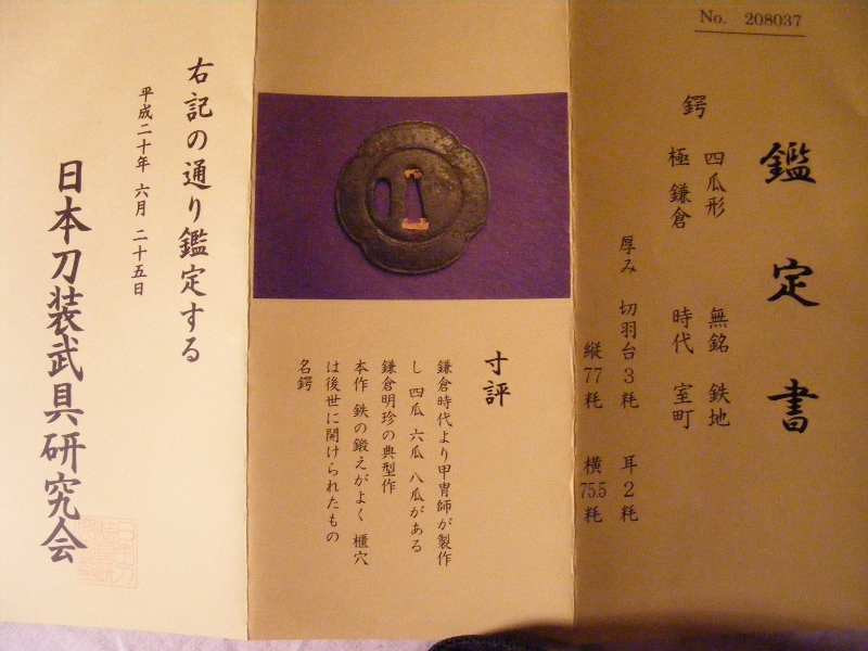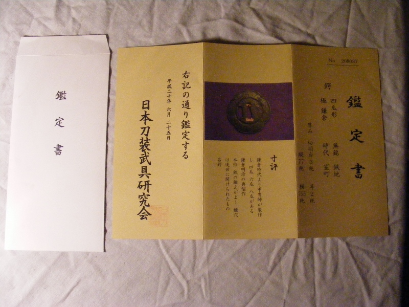 Hello gentlemen, Iv had this tsuba for a few years now, it come with papers but never bothered with getting the papers translated because I just enjoyed the tsuba for what it was. I think its muromachi and maybe kamukura school, but I like it for its almost "rural" style and decoration, its almost razor thin too which just adds to its attractive qualities. Can I please ask for your ideas on this piece and what type of papers they are please. kind regards Hamish