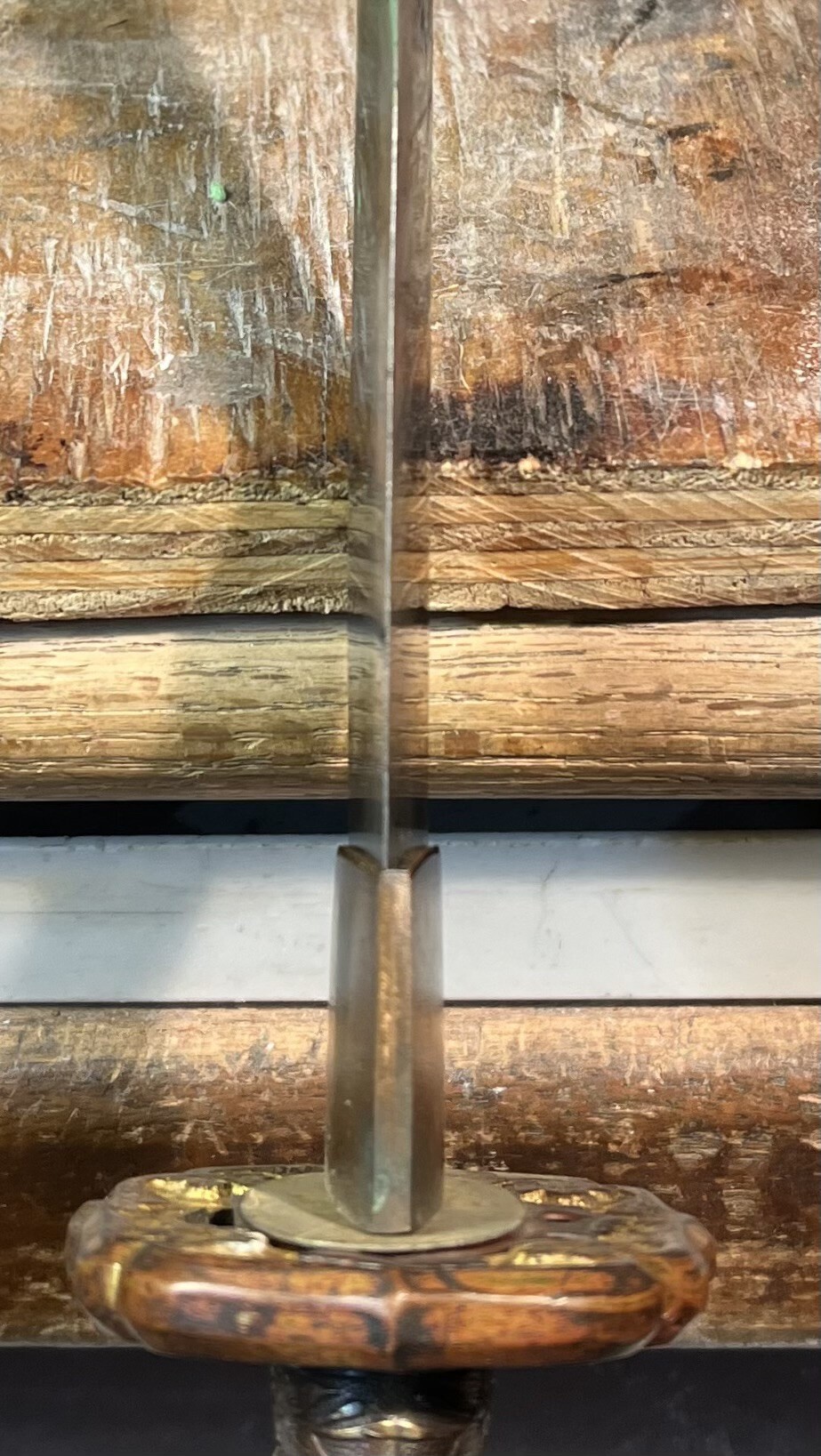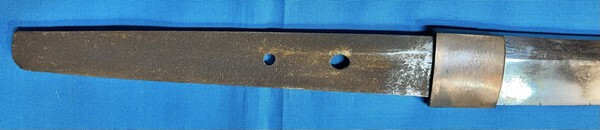 Well I made a simple brass band and put a simple patina on it. I did this to stabilize the scabbard. The scabbard no longer comes apart. See pics. I also realized that the blade is a nihonto mumei! Too bad it has sections of rust. -