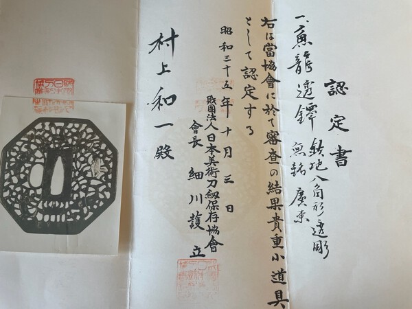 Hope all is well wherever this message finds you. Thank you in advance for asking for help on this one, I have tried to figure it out for a while and just haven't had luck. What does the paper say? At first glance, I think nanban, then arabesque pattern, but with koi fish...I just don't really know. Has a lovely patina and this is the paper that came with it. Thanks, again and I will make a donation to the forum for the help.