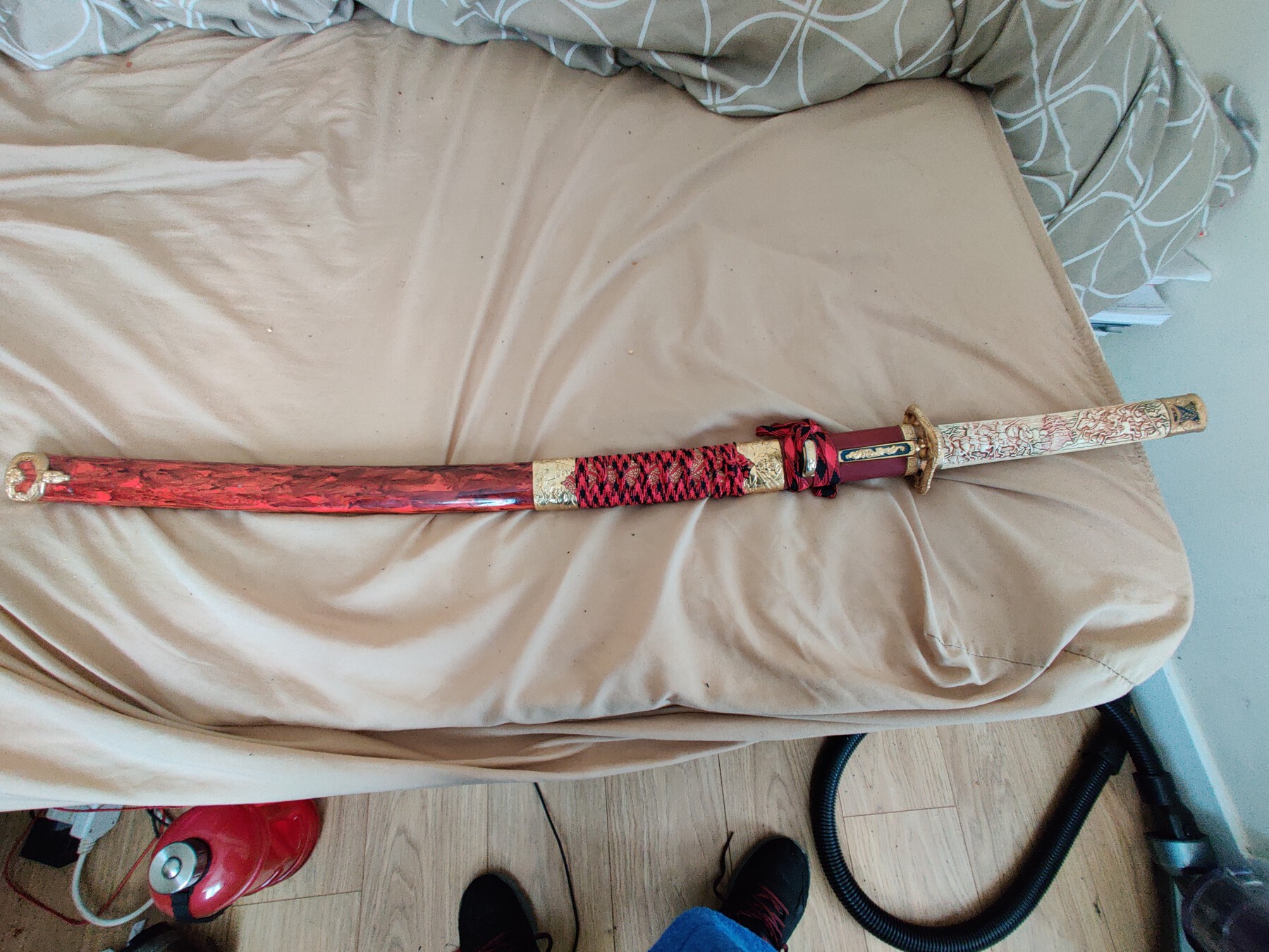 The biggest issue I'm having is there is no clear way to dismantle the blade (I believe there's usually a little latch on most katana) as all of the grip is some kind of bone/ivory/imitation. The scabbard itself is my biggest worry of it being something cheap, as the bottom feels very plastic like, and some of the swords decoration feel rather flimsy too.
