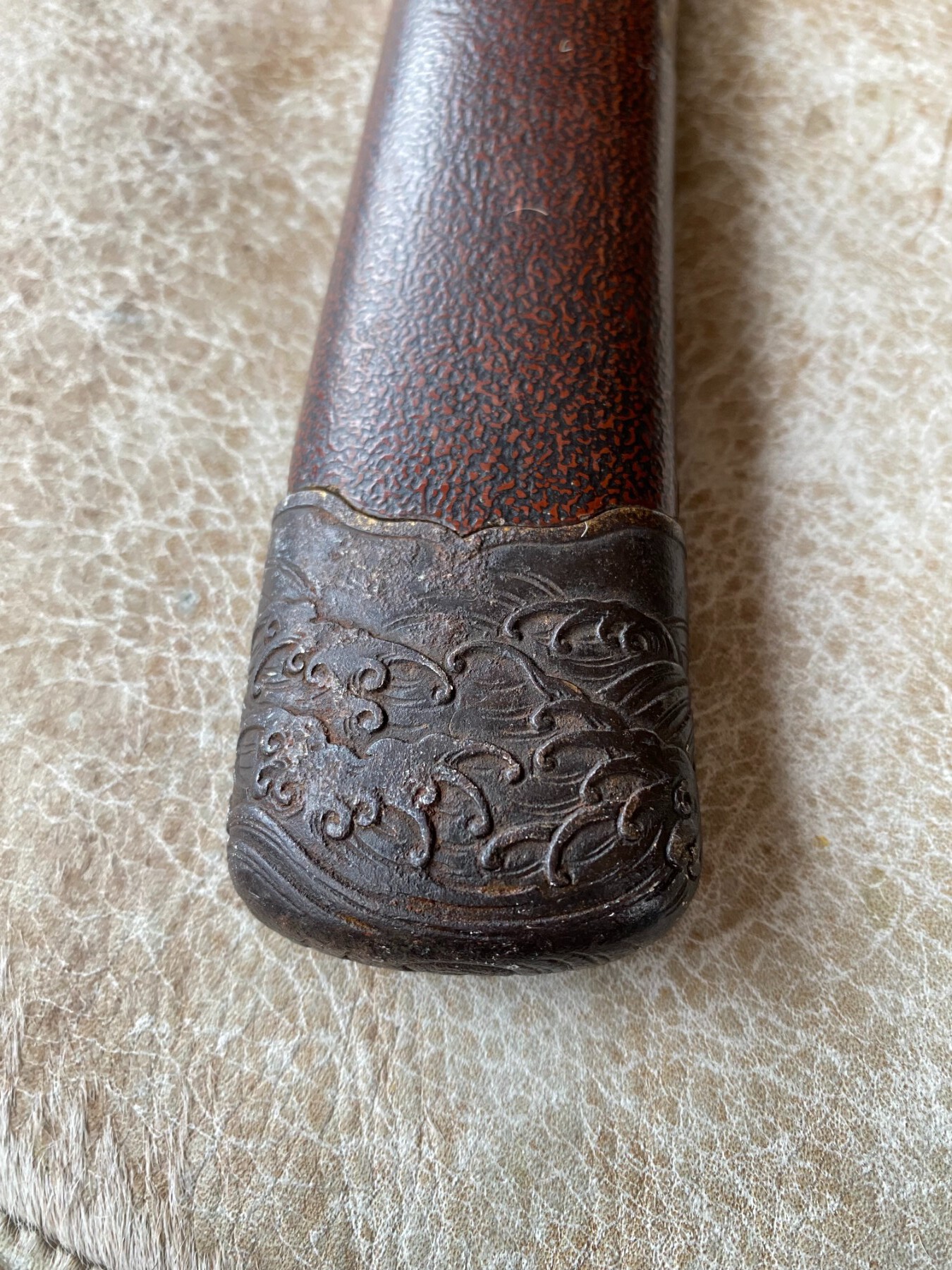 Attached are some photos, and I'd love to learn anything I can about the tsuba, tsuka, and these fittings. I know the condition is not ideal, I wish it were maintained better before I acquired it. Before I acquired it, the saya had been spray painted gold... Over the years it has flaked off thankfully, but remnants remain on the decorative cap at the end of the saya. Any advice on removal would be appreciated, or even if I should bother attempting. I will be posting more photos of the blade in the Nihonto forum soon.