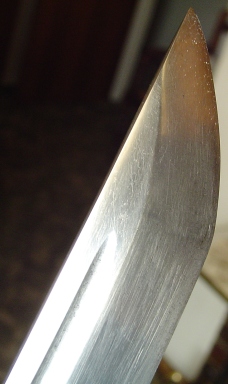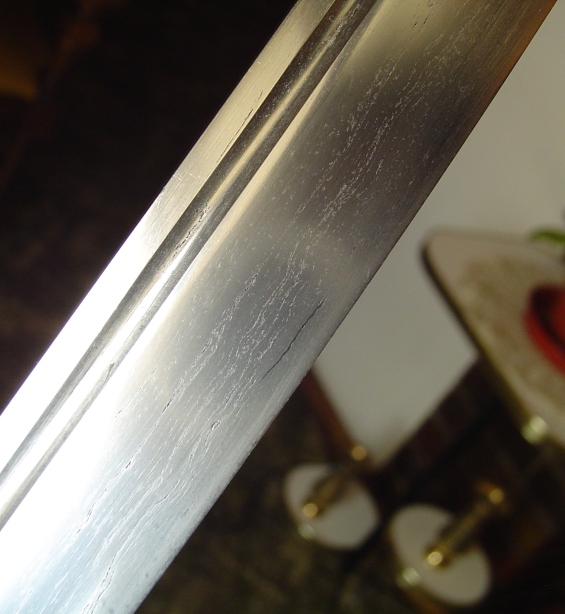 Here are a few more pictures of the sword in question. The hada is only visible in one spot protected by the habaki. The is a bit of weak ayasugi just under the shinogi but I'm strugling to see good masame that would help sugest Mino influence. The shinogi is no raised at all. Hopefully the picture shows the proportion of the kissaki (it has a notare komi boshi with very short ko-maru turnback on one side, can't see on the other. Hamon is nioi deki with sporadic nie scattered