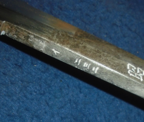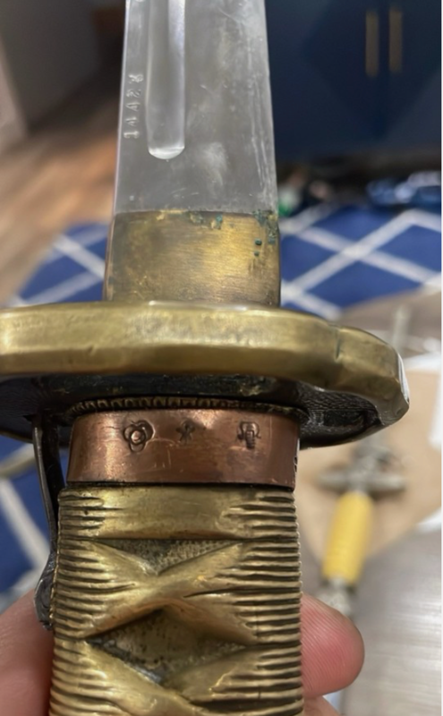 Jeffrey: Some additional information about the sword. It is missing the wrap (ito) on the handle (tsuka) and the flower shaped ornamental elements on the handle that assist with grip (menuki), however it's still a nice rig. And to explain a little about fake signatures, it is VERY common and should not detract from it being a piece of WW2 history. It is entirely possible that someone took his family blade (or a donated blade) and put military fittings on it. I wouldn't sell it until you settle into some research and get more details. John C. p.s. The handle wrap and menuki can be replaced in order to make it present well, if that's what you choose to do.