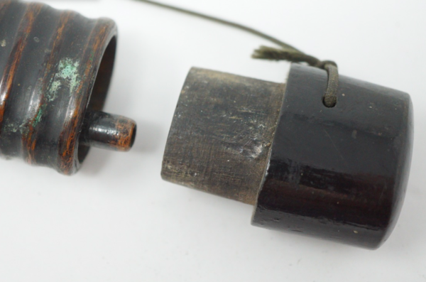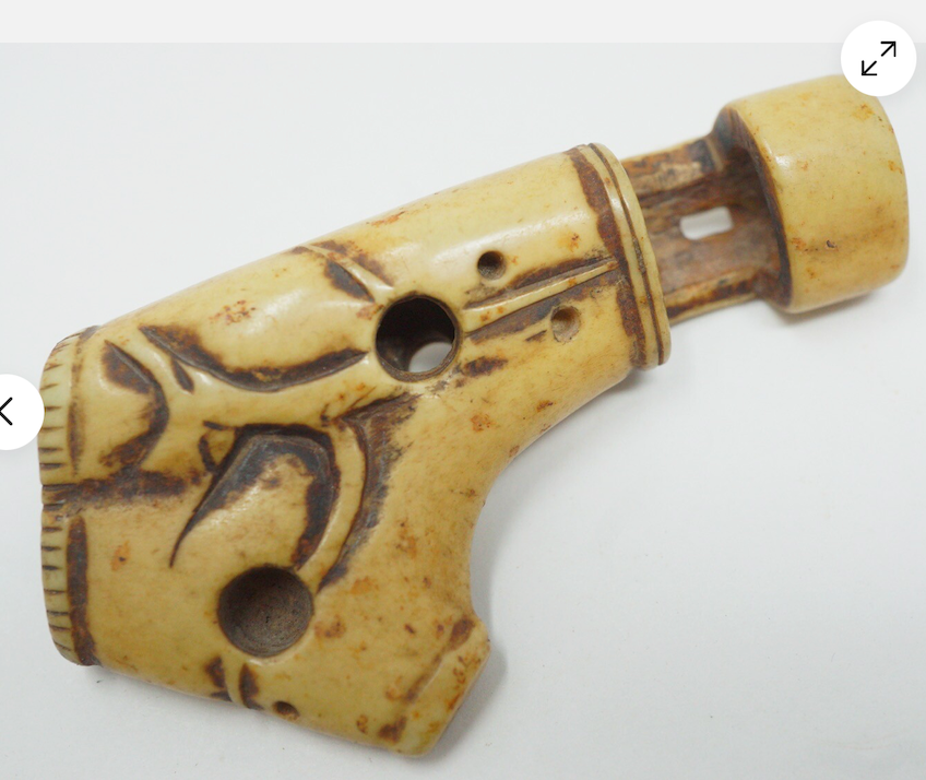 Just to add one more pic for identification, all of these (found 3 so far) have nearly identical holes including a large openning at the bottom. All listed as netsuke. But I don't think any one of the sellers has a clue what it is. I've seen similar items as pipes and powder flasks, though without the large openning. John C.