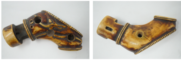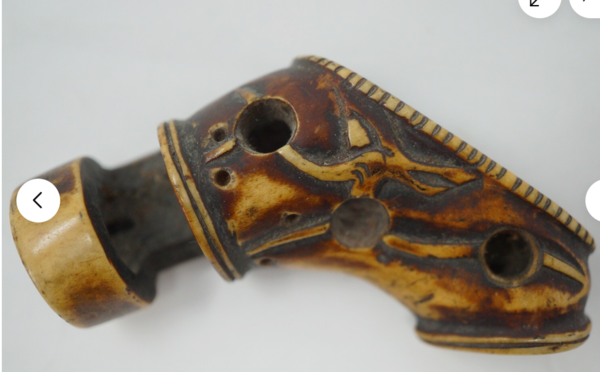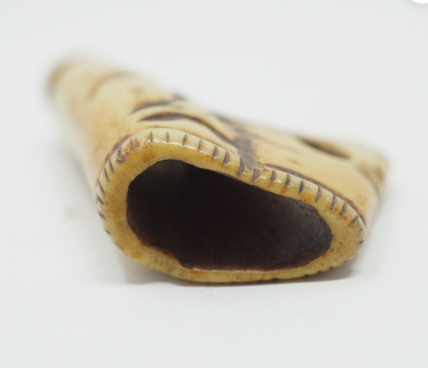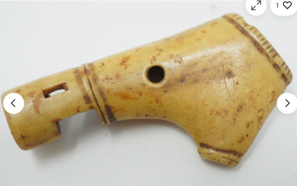I agree that it is antler. Doesn't seem like it could whistle with such a large opening. A powder horn attachment of some type? John C.