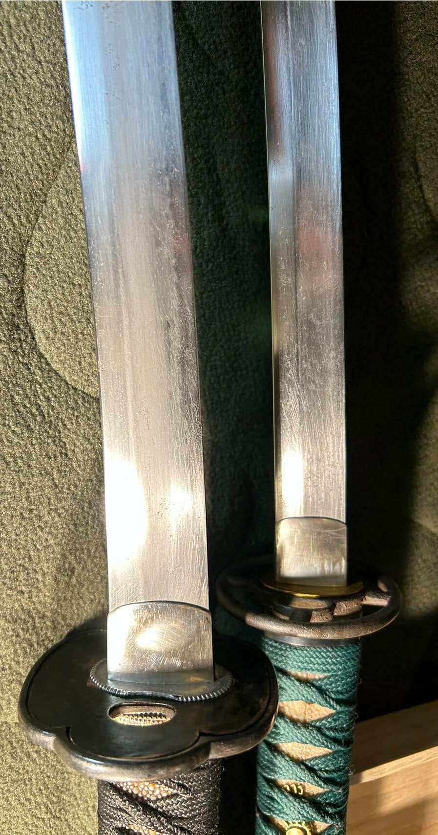 I have attached a few images, including a side by side with another Wakizashi as a size comparison. The previous owner suggested it may have been specifically made for a person of slight stature, but obviously this is conjecture. Would anyone have any information or suggestions about these lighter, narrower blade history (or mei authenticity etc) ? I've gone through my books and spent some online time but haven't found any references to how common they were.